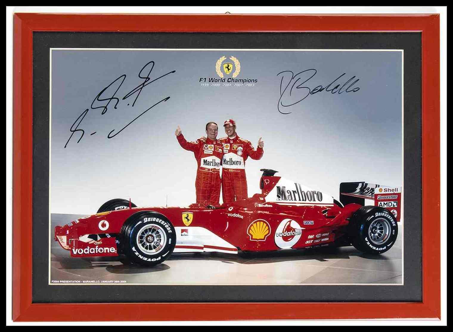 Foto ufficiale da stage fotografico per la presentazione della FERRARI F1 2004, con Michael Schumaker e Rubens Barrichello intorno alla vettura. Foto autografata ad inchiostro indelebile nero, scritte di pugno (non stampate) da Schumaker (sinistra) e Barrichello (destra). La foto è conservata anche con la sua custodia di store Ferrari, originale. Questo è uno degli scatti eseguiti durante la presentazione ufficiale della F2004 del 26 Gennaio 2004 a Maranello, come si legge in basso a sinistra F2004 PRESENTATION - MARANELLO, 26th JANUARY 2004