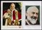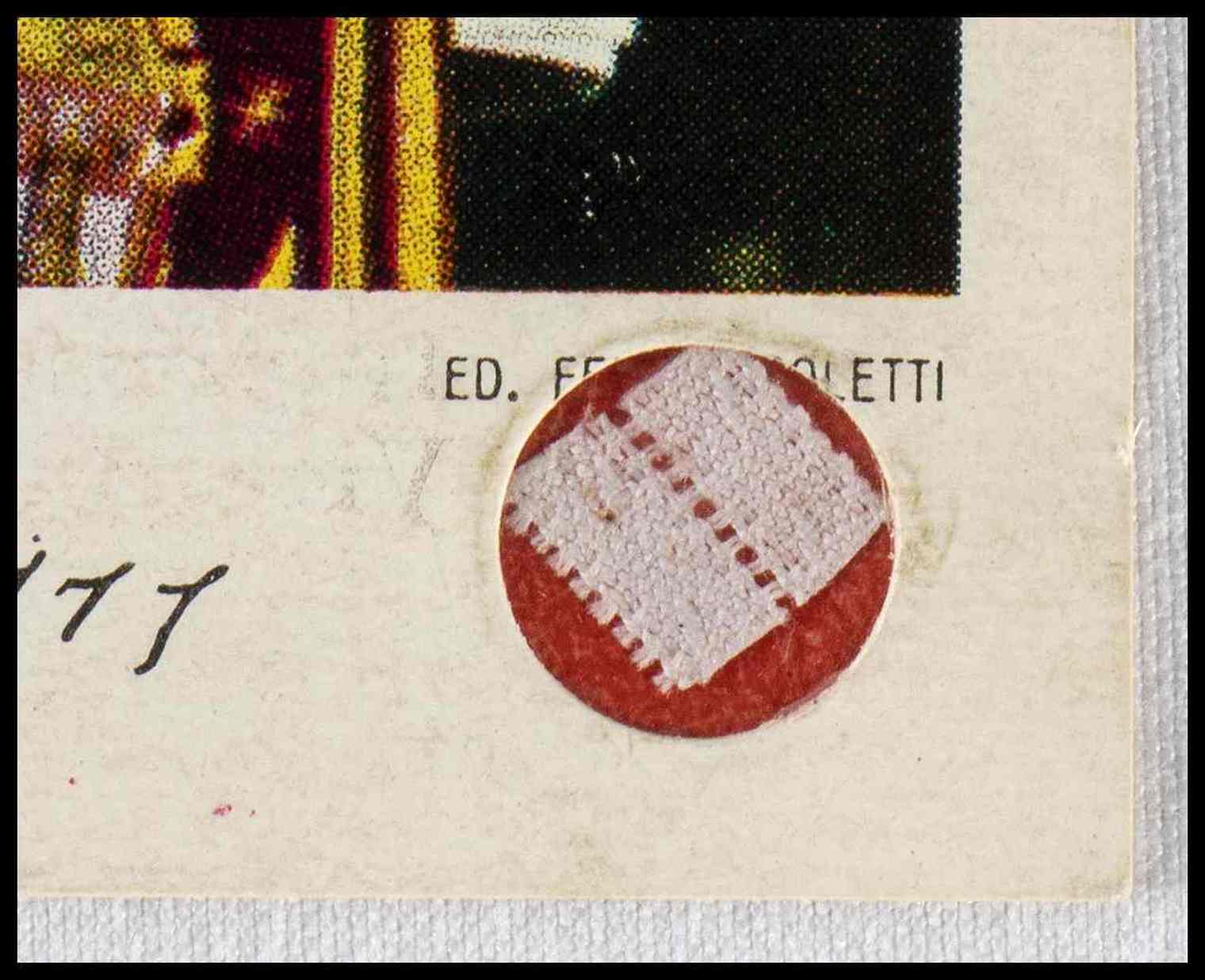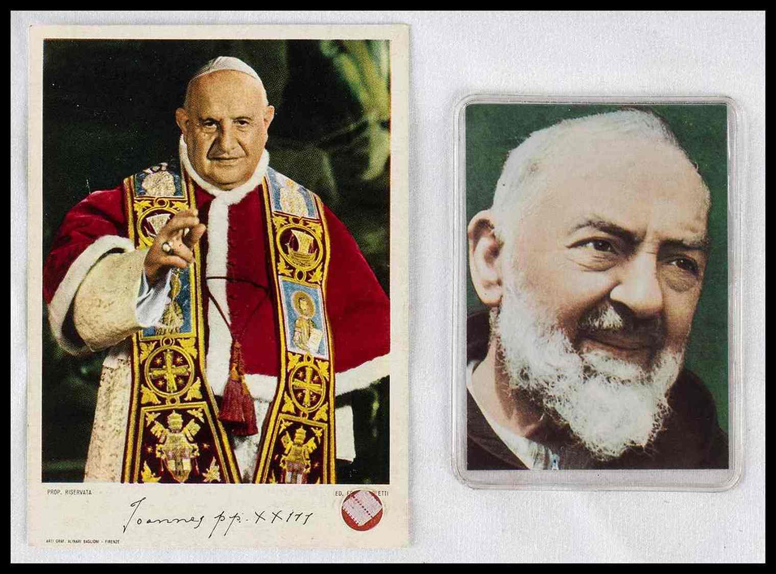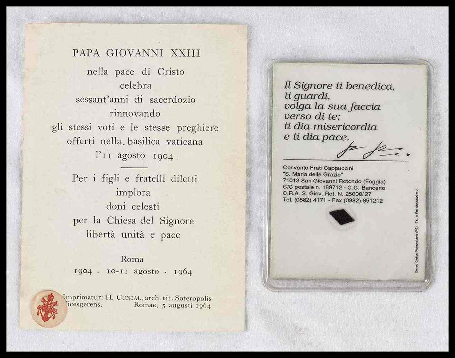 Lotto di due reliquie : cartoncino fotografico di Papa Giovanni XXIII con piccolo frammento di veste in cotone bianco, applicata in basso a destra e protetto da sigillo pontificio,con stemma del casato Roncalli, celebrativo dei 60 anni di sacerdozio (1904-1964) ; cartoncino fotografico plastificato, di Padre PIO con piccolo frammento di veste francescana in cotone marrone, applicato al retro della foto, souvenir del convento dei Frati Cappuccini "S.Maria delle Grazie" di San Giovanni Rotondo