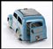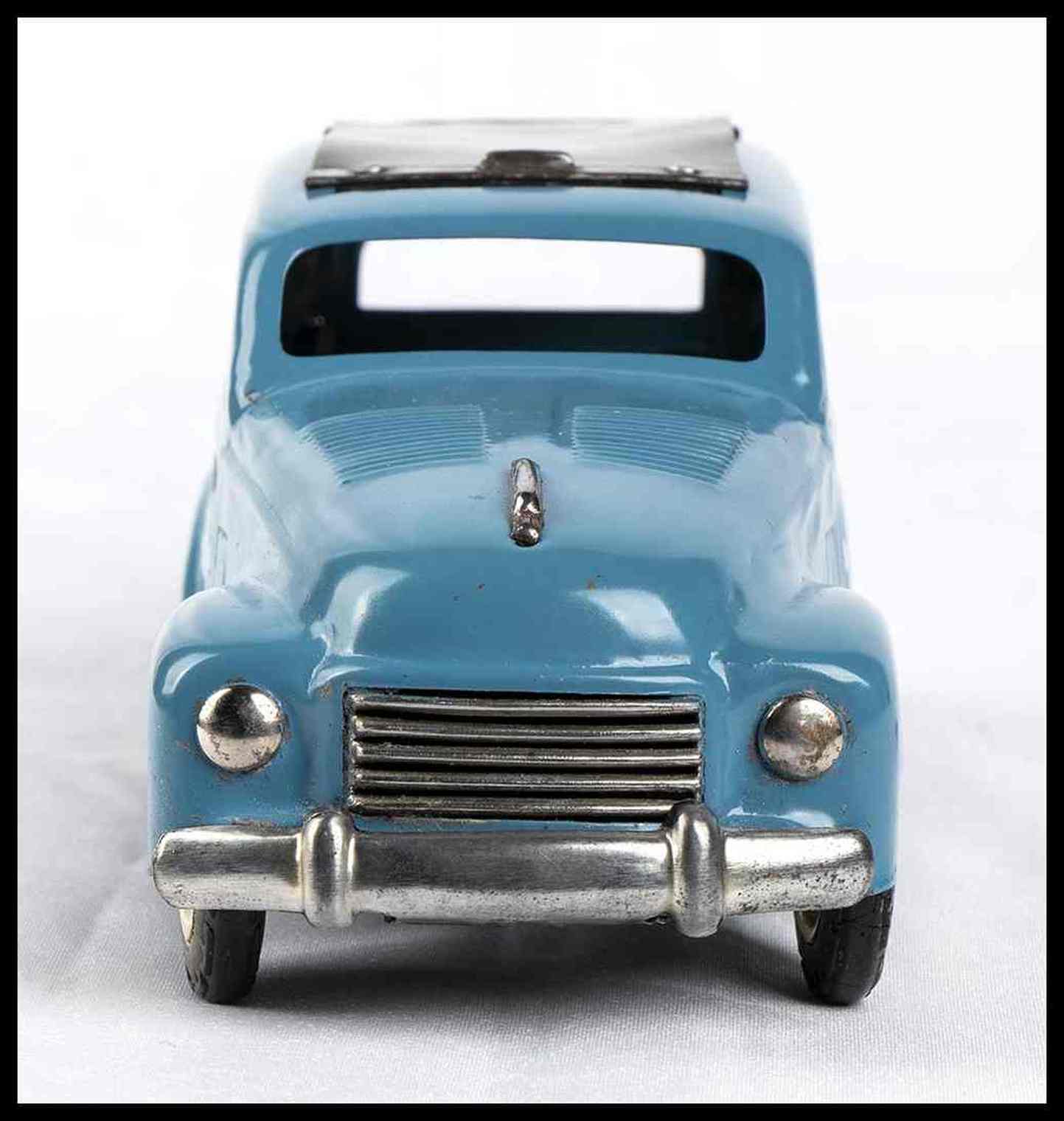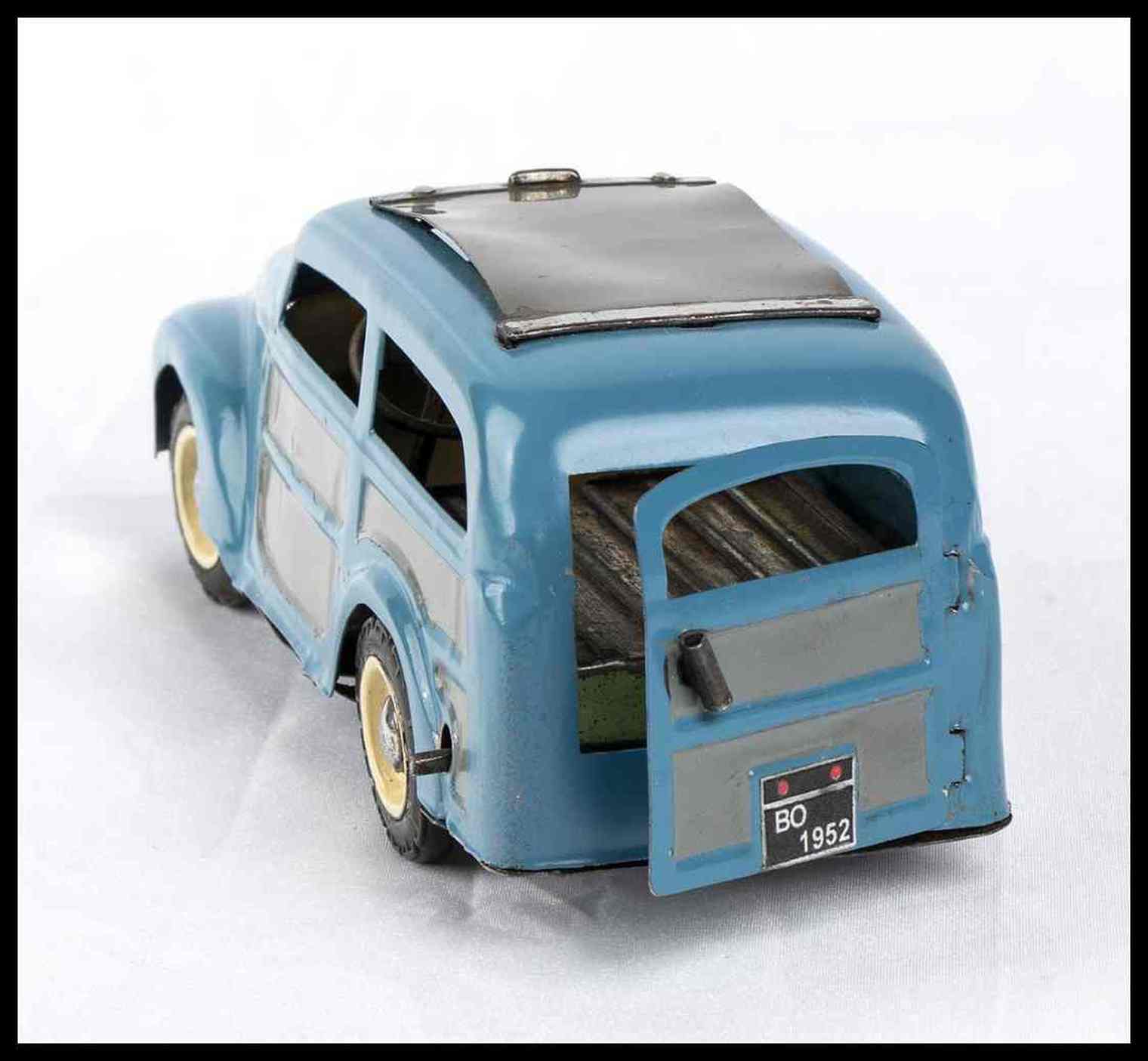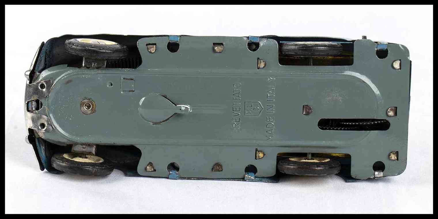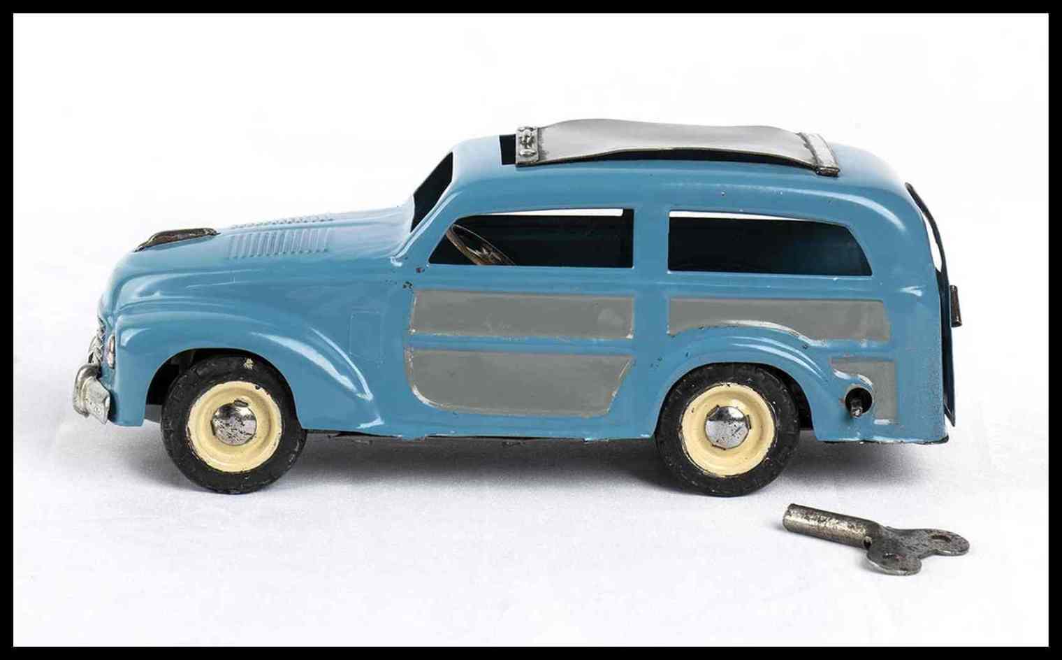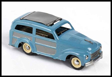 Automodello giocattolo prodotto dalla AMB Agostino Marchesini, Bologna, riproducente la FIAT 500 C Giardinetta "Topolino" con tettuccio scorrevole. Sportello posteriore apribile, targa BO 1952 adesiva originale, ruote con pneumatici in gomma originali, colorazione originale blu con modanature grigie, tettuccio scorrevole in plastica grigia. Meccanismo con carica a molla, funzionante. Con chiave di carica originale.