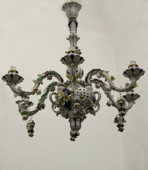 Lampadario in porcellana di Capodimonte con sei bracci decorato a motivi...