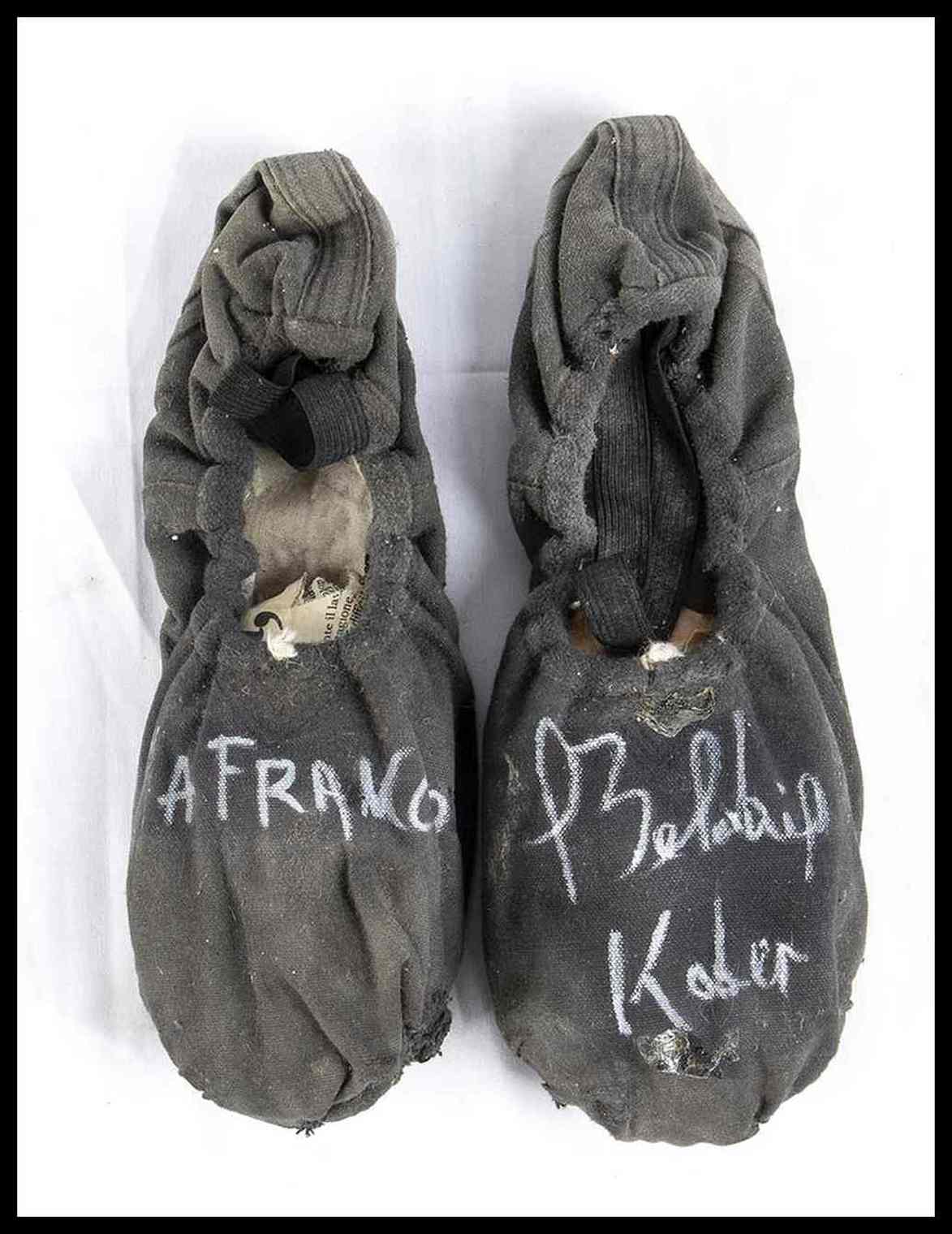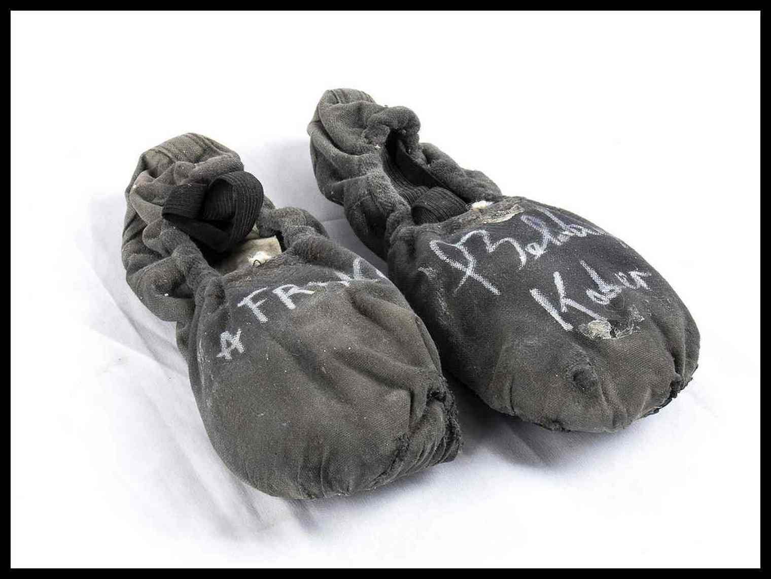 Paio di scarpette "mezzepunte" da danza, in tessuto nero, con dedica ed autografo originali scritti a pennarello indelebele bianco da Kader Belarbi. Usate nel "Prelude à l'après Midi d'un Faune". Ballerino di danza classica dal 1980 al 2008 circa, nominato ETOILE da Rudolf Nureev nel 1989. "Danseur étoile" (per gli uomini) o danseuse étoile (per le donne), letteralmente "ballerino stella", è il più alto grado che un ballerino può raggiungere al Balletto dell'Opera di Parigi.