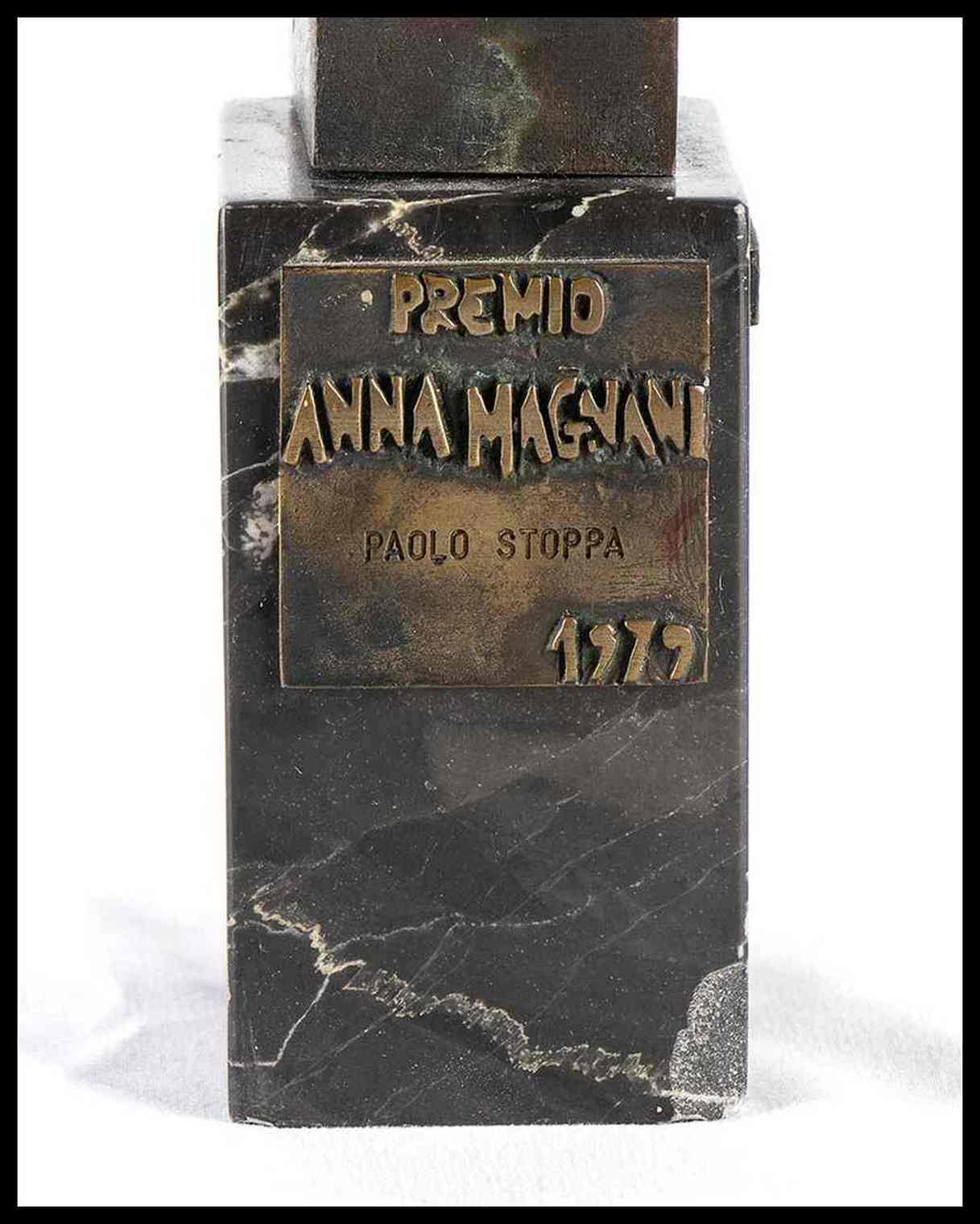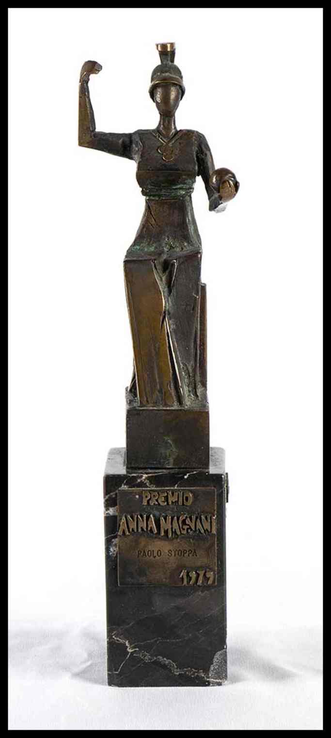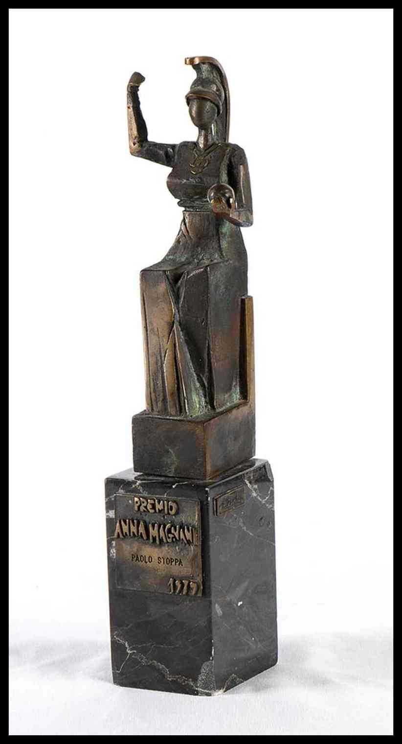 Statuina in bronzo su base in marmo, targhetta in bronzo applicata "PREMIO ANNA MAGNANI 1979" a Paolo Stoppa, Altra targhetta in bronzo, applicata, recante la firma dell'autore F.Zevola