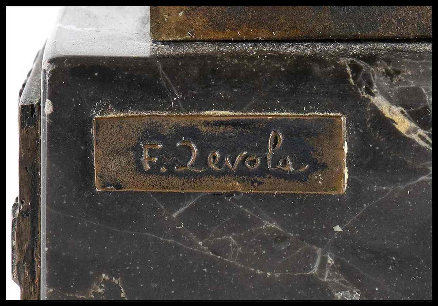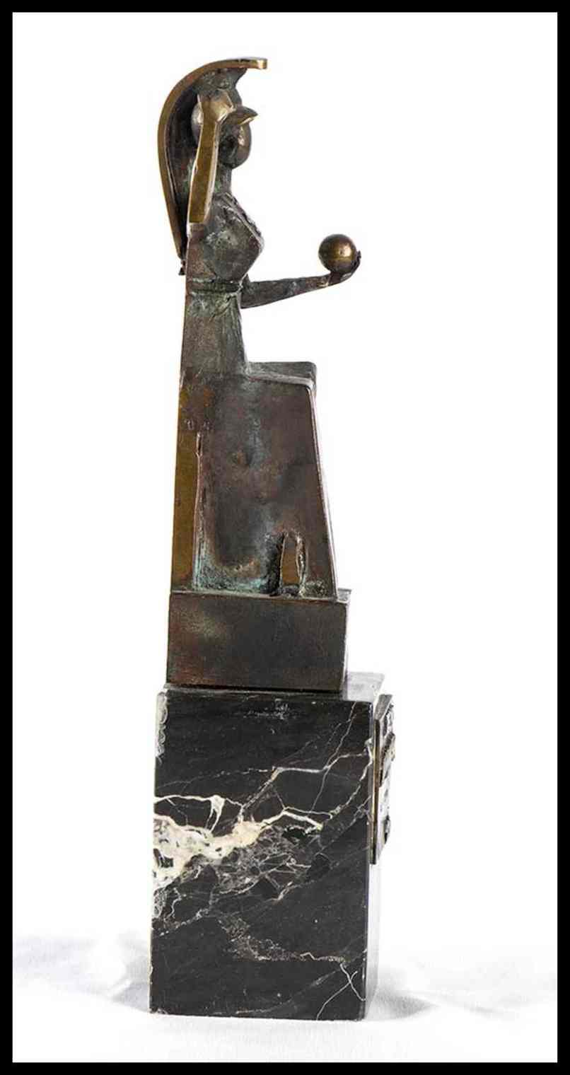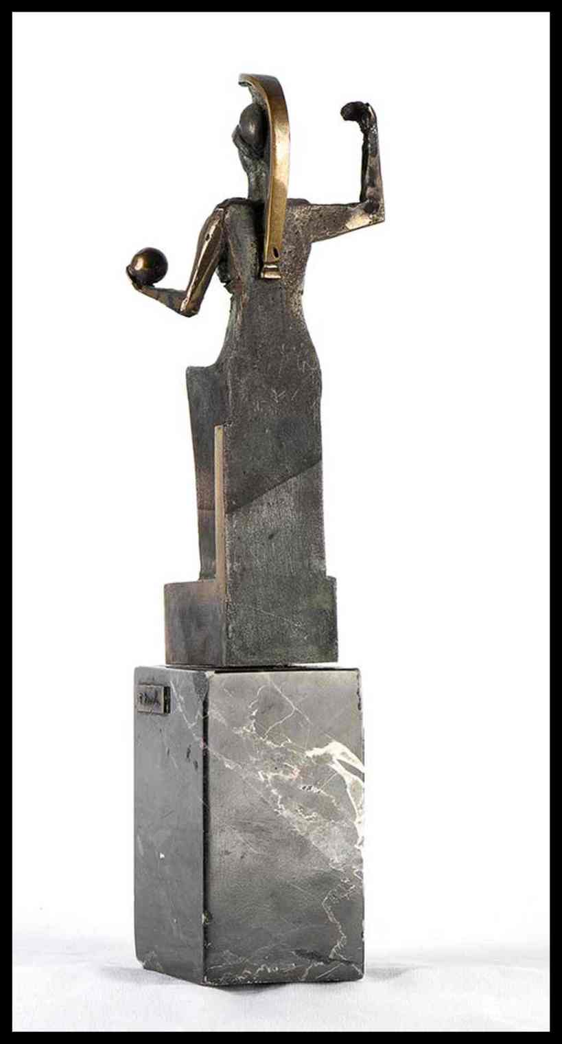 Statuina in bronzo su base in marmo, targhetta in bronzo applicata "PREMIO ANNA MAGNANI 1979" a Paolo Stoppa, Altra targhetta in bronzo, applicata, recante la firma dell'autore F.Zevola