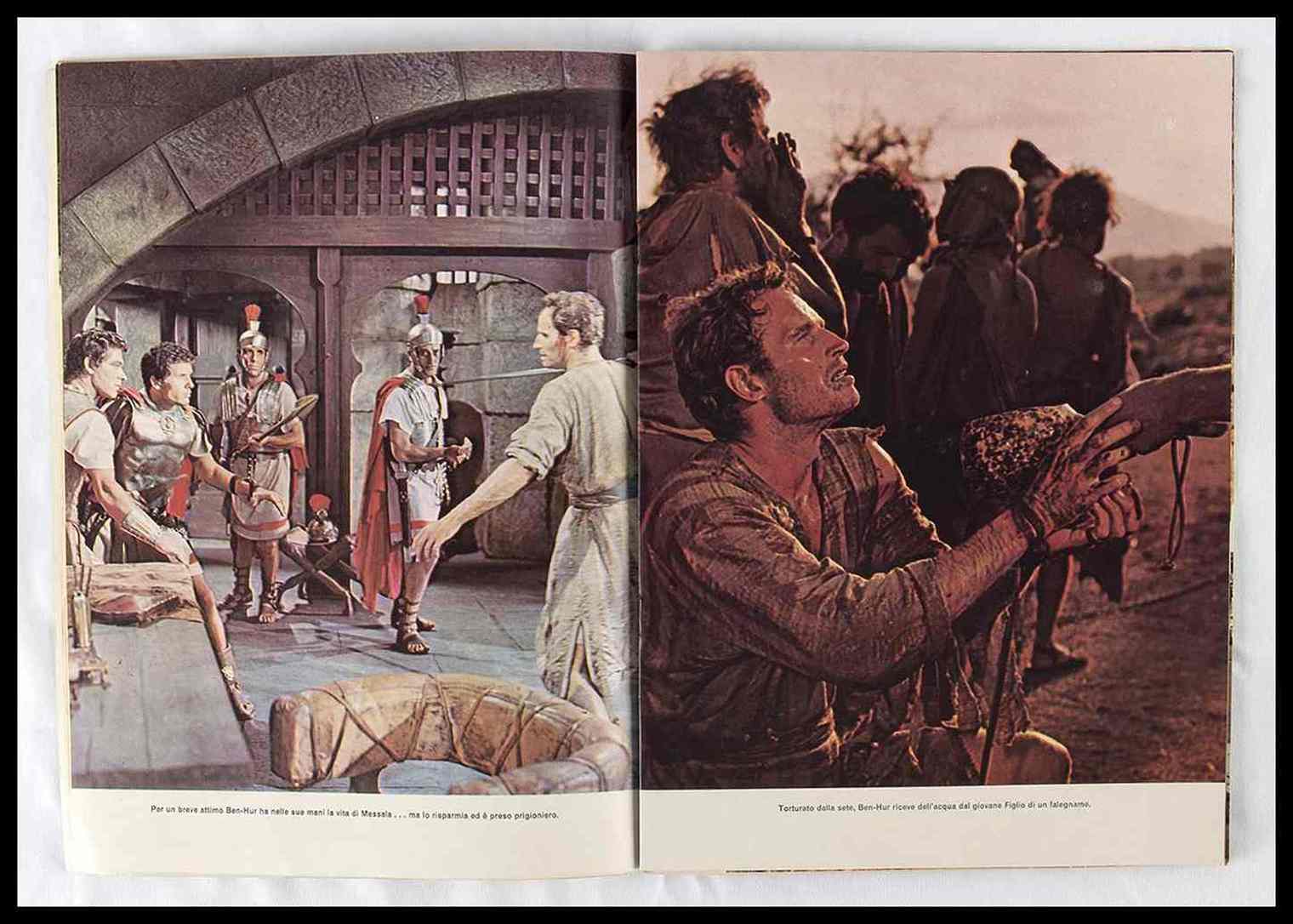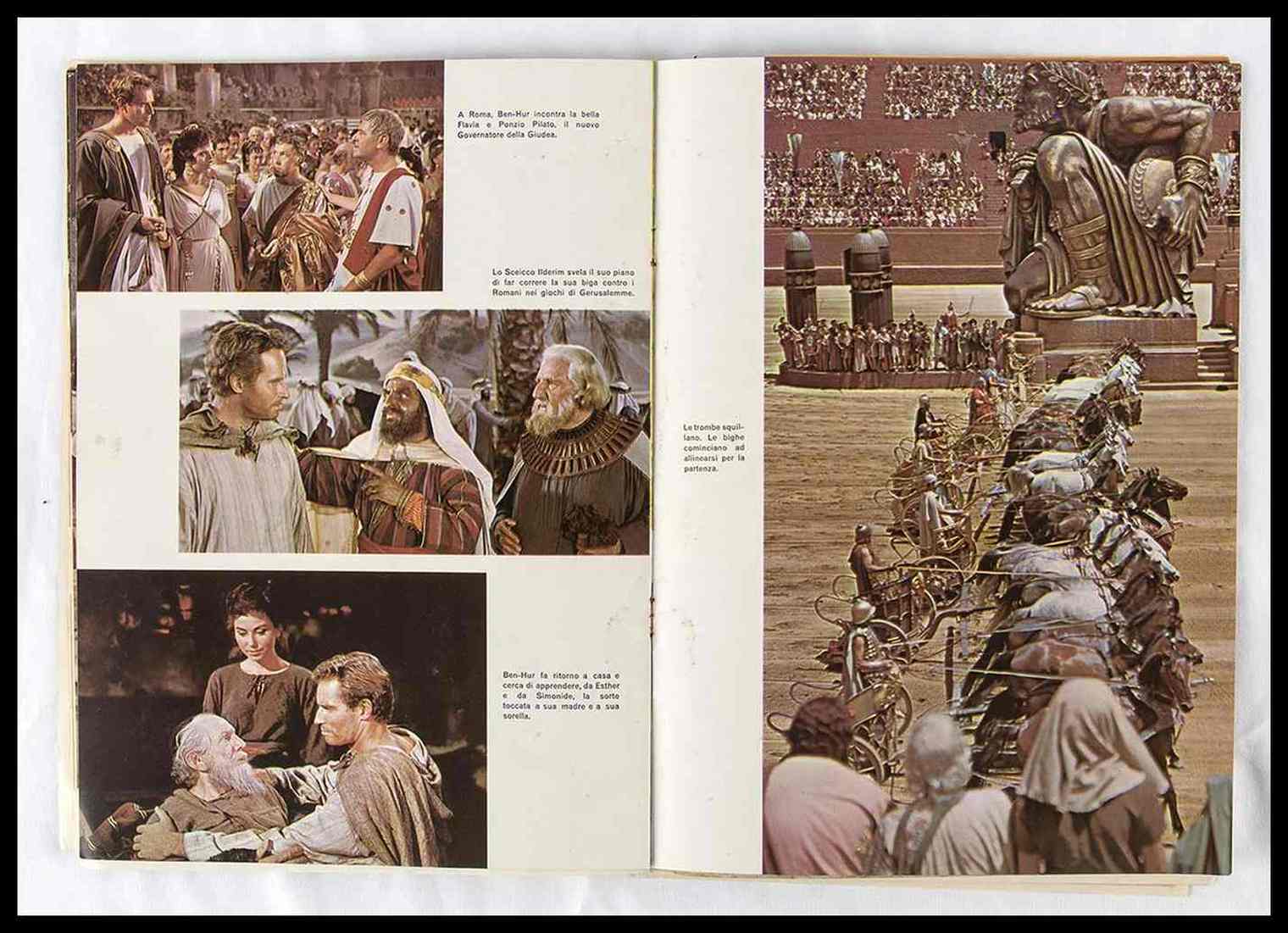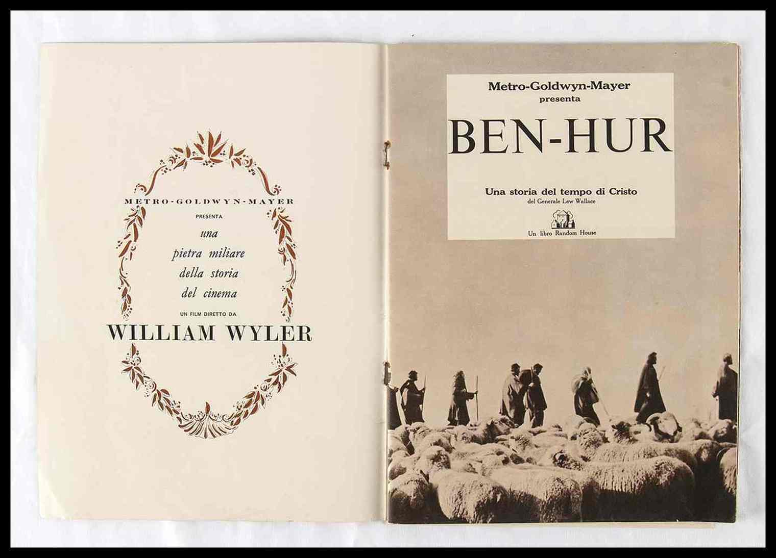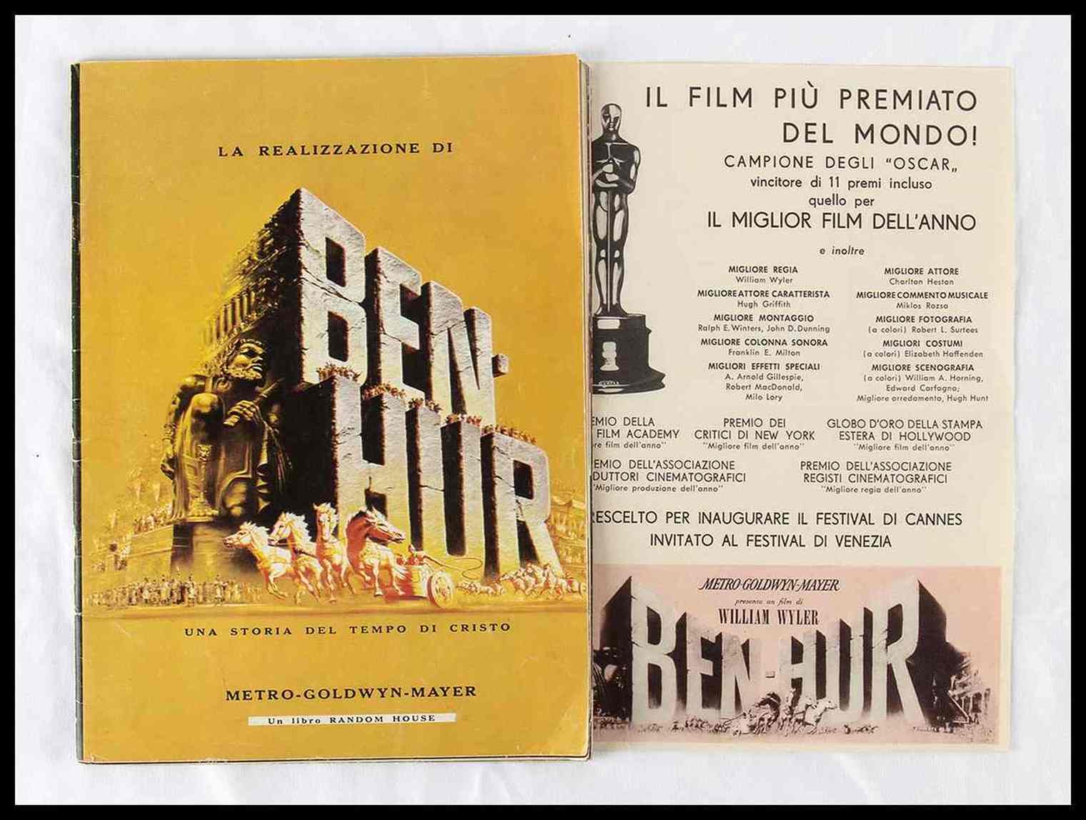 Libretto / brochure originale per la pubblicizzazione del film BEN HUR della Metro Goldwin Mayer, vincitore di 11 premi Oscar, diretto da William Wyler, con Charlton Heston nel ruolo principale. Il libretto si compone di 32 pagine riccamente illustrate con foto a colori e descrizioni della trama del film ed altre informazioni. In aggiunta una locandina pubblicitaria del film Ben Hur