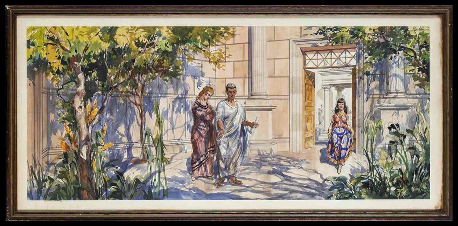 Bellissimo bozzetto, matita e acquarello, per le scene del film CLEOPATRA del 1963, con Elizabeth Taylor. Probabile esecuzione per lo storyboard del film usato per le riprese a Cinecittà