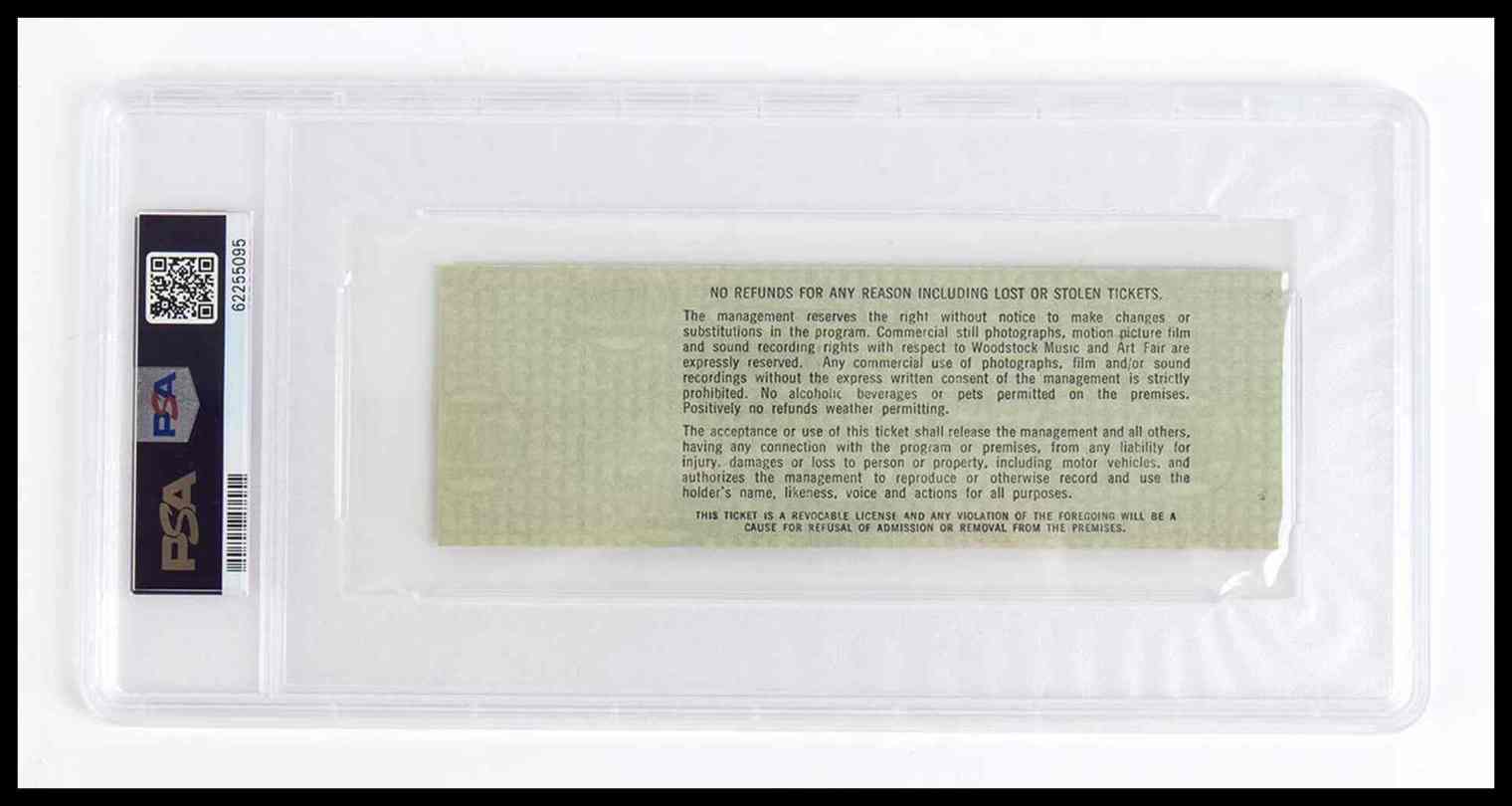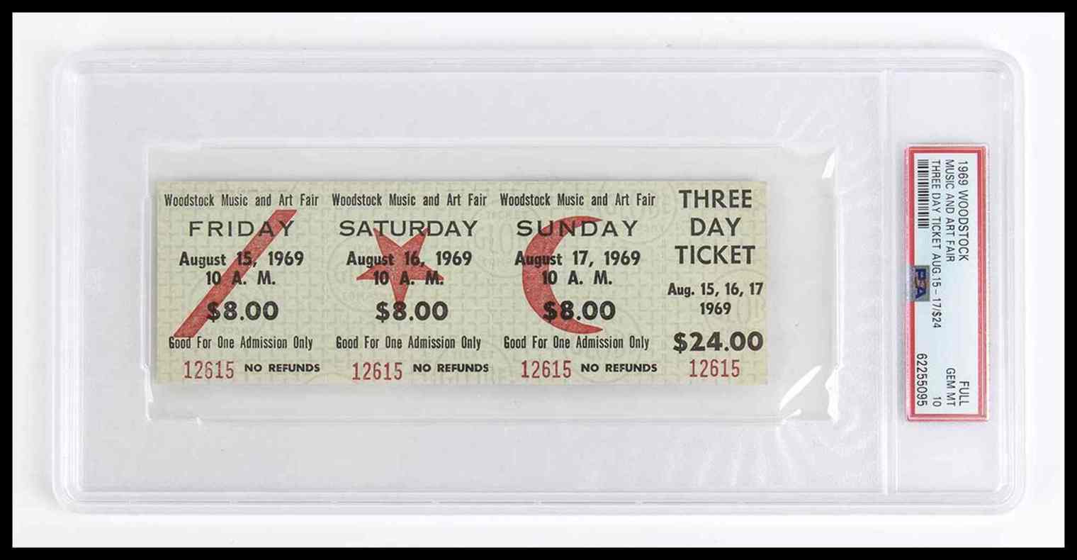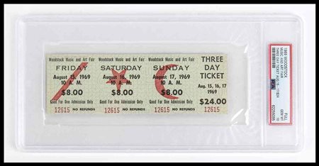 Biglietto originale di ingresso al WOODSTOCK MUSIC AND ART FAIR - THREE DAY TICKET. Non utilizzato, completo dei tre tagliandi per le date del concerto 15,16,17 Agosto 1969 , ognuno valido per un solo ingresso. Costo del biglietto $24, ovvero $8 per ogni tagliando. Biglietto perfetto, sigillato all'interno di un supporto di plastica con autentica americana PSA