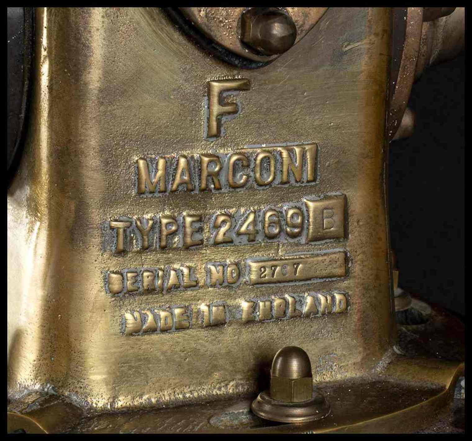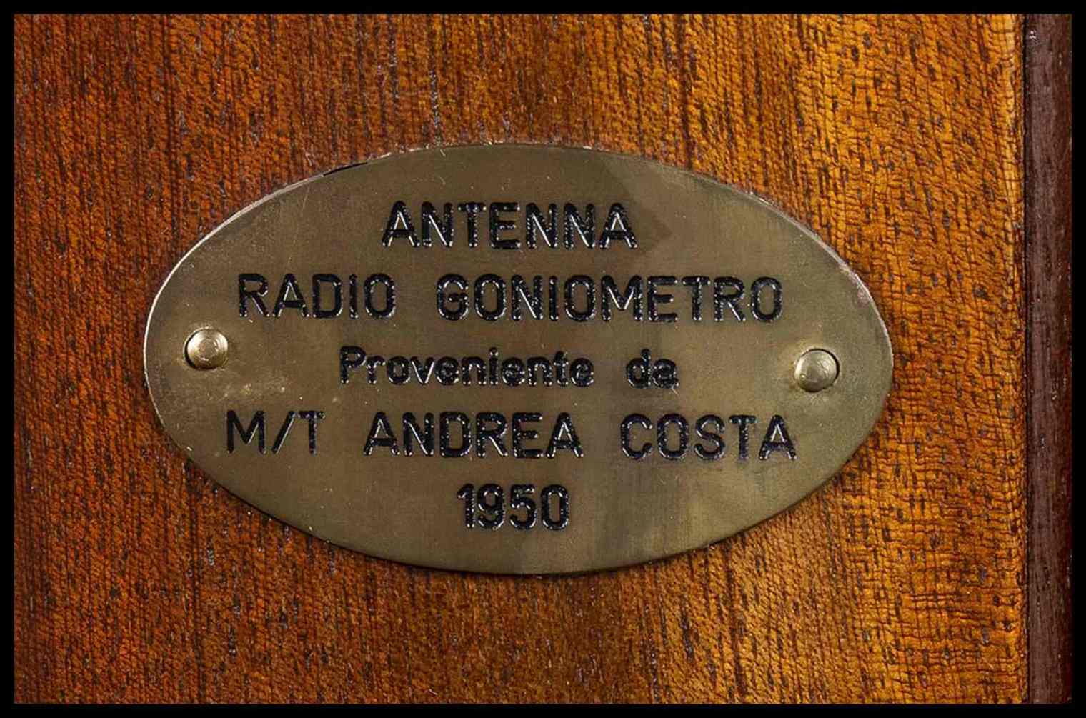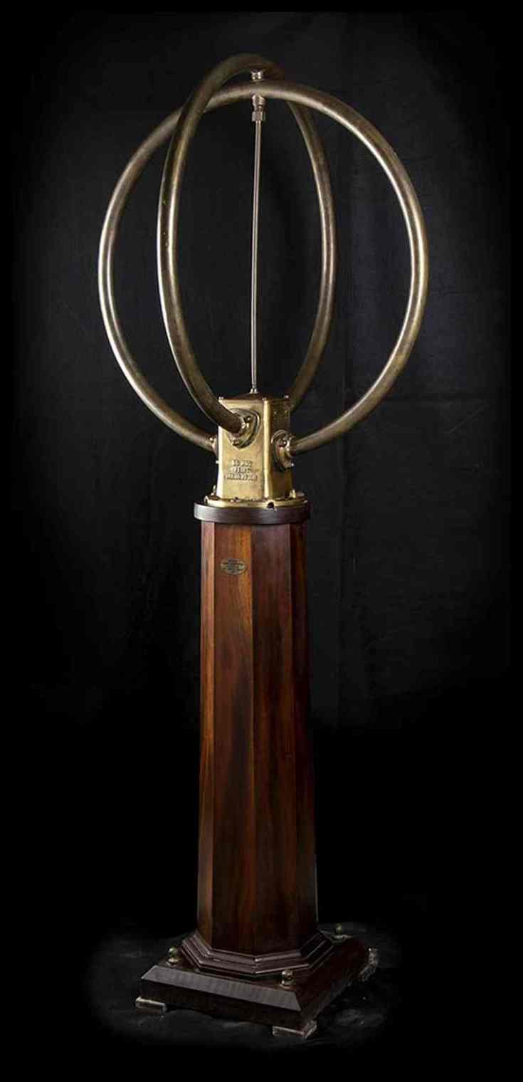Rarissima, museale antenna radio goniometro, modello "F" MARCONI - TYPE 2469 B - Serial. N.2767 - L'antenna navale di tipo a loop incrociato, realizzata con tubi in lega, un modello simile fu quella in uso sul panfilo Elettra riequipaggiato dallo stesso Marconi durante gli anni 1930. Proveniente da ultimo uso su Moto Nave da Trasporto Andrea Costa, seconda metà '900. Montata su bella base tronco conica a sezione ottagonale, in legno di mogano, imponente presenza