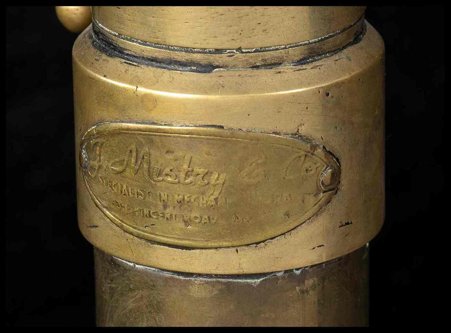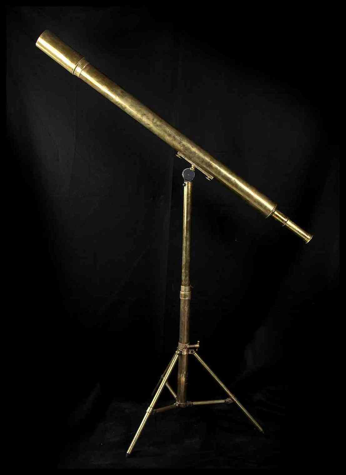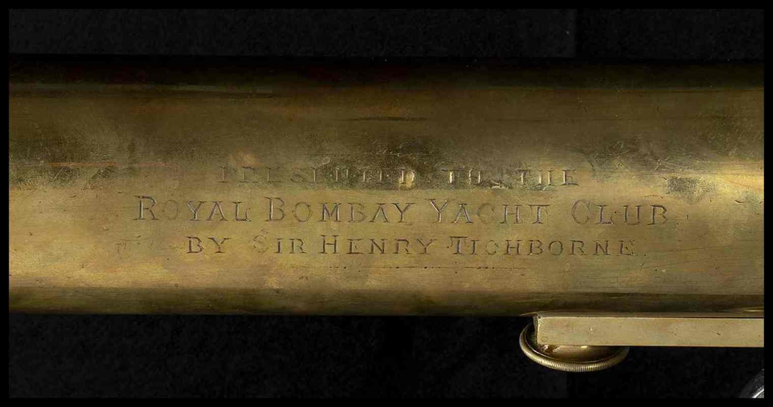 Corpo in ottone, con proprio treppiede di sostegno. Etichetta in metallo applicata MISTRY & Co - SPECIALIST IN MECHANIC - VINCENT ROAD . Altra incisione sul corpo del cannocchiale "ROYALE BOMBAY YACHT CLUB , By Sir Hnery TIGHBORNE" - Inizi '900