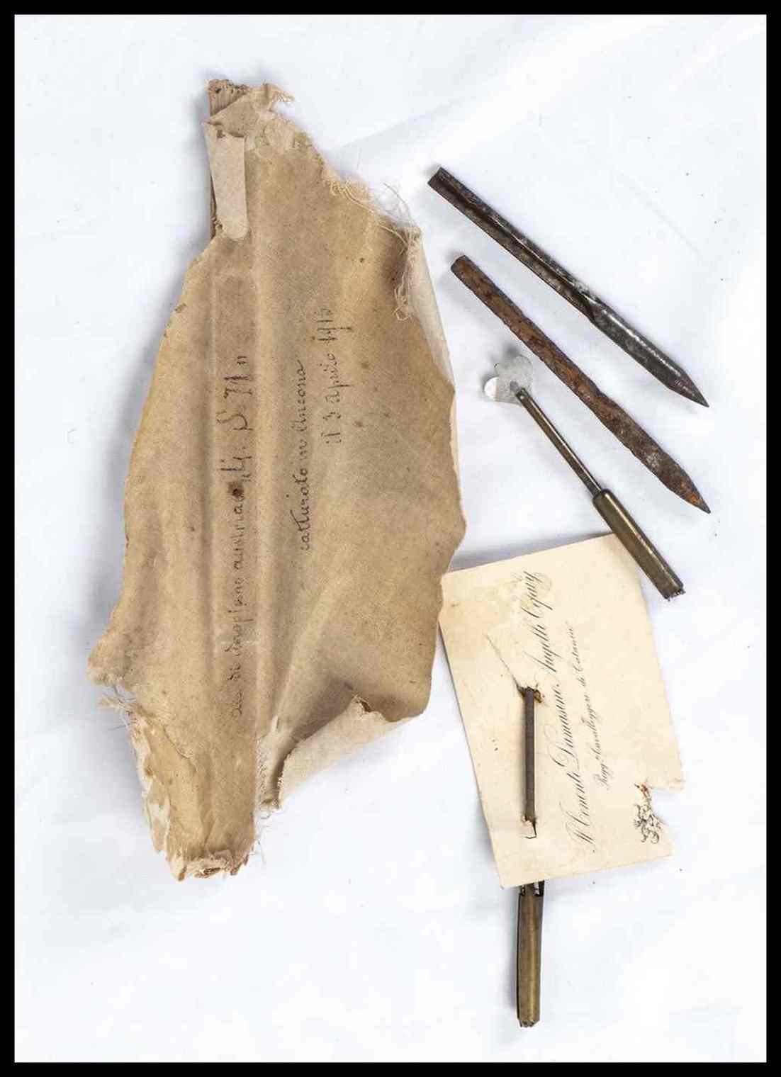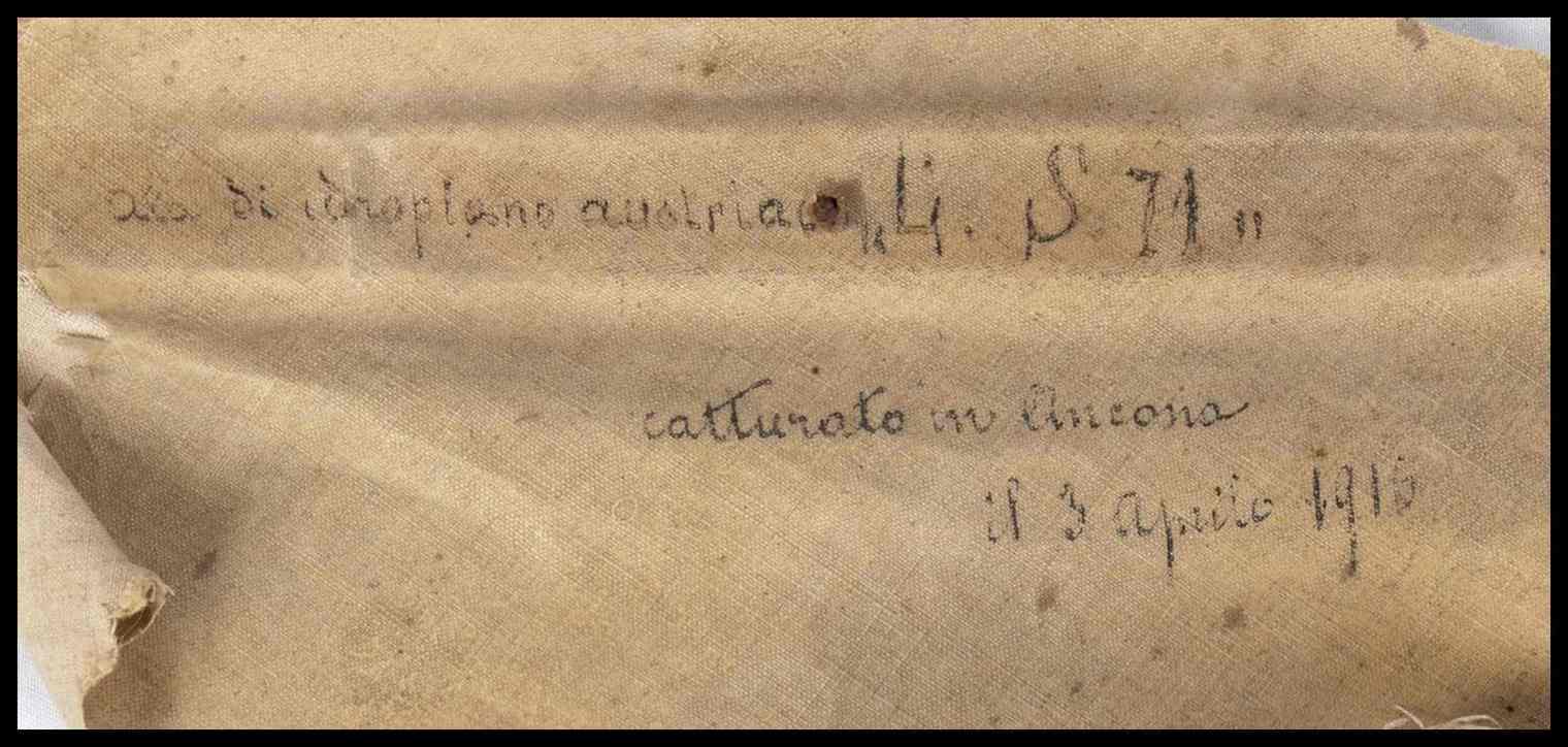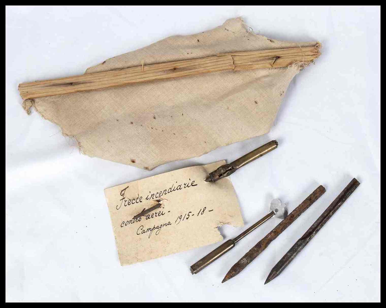 Suggestivo cimelio della Prima Guerra Mondiale, un brandello di tela di una ALA DI IDROPLANO AUSTRIACO "L. S 71" - CATTURATO IN ANCONA IL 3 APRILE 1916 come da nota scritta ad inchiostro nero sulla stessa porzione di tela. L'idrovolante in questione era un LOHNER classe S di produzione austriaca, da ricognizione e bombardamento, monomotore, usato dalla K.u.K. Kriegsmarine ovvero la Marina militare autro-ungarica. Insieme abbiamo alcune frecce incendiarie contro aerei, usate nel 1915-18, raccolte sempre nel territorio marchigiano