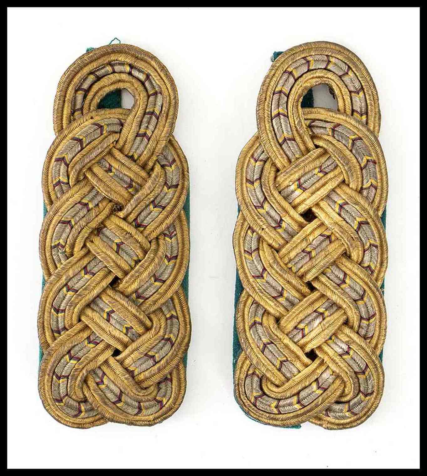 Gallone dorato ed argentato con filettature giallo-rosse, fondo di panno verde con ponticello di fissaggio