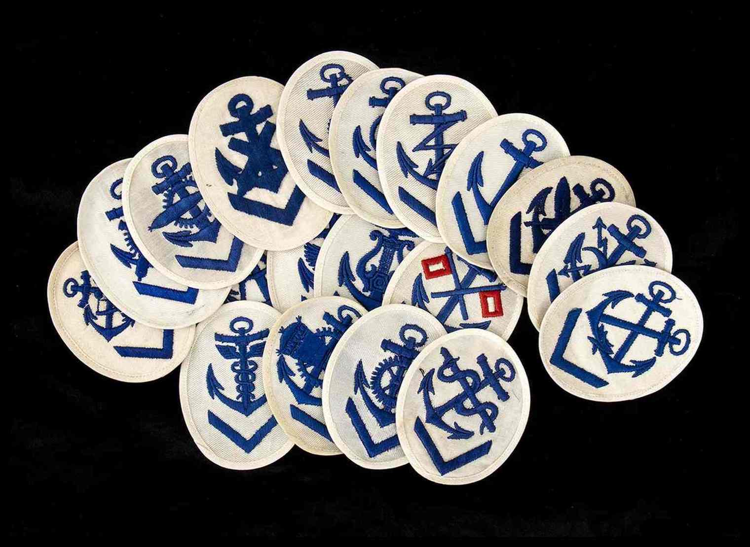18 distintivi di carica per uniforme bianca da marinaio della KM, ricamati in azzurro su tela bianca