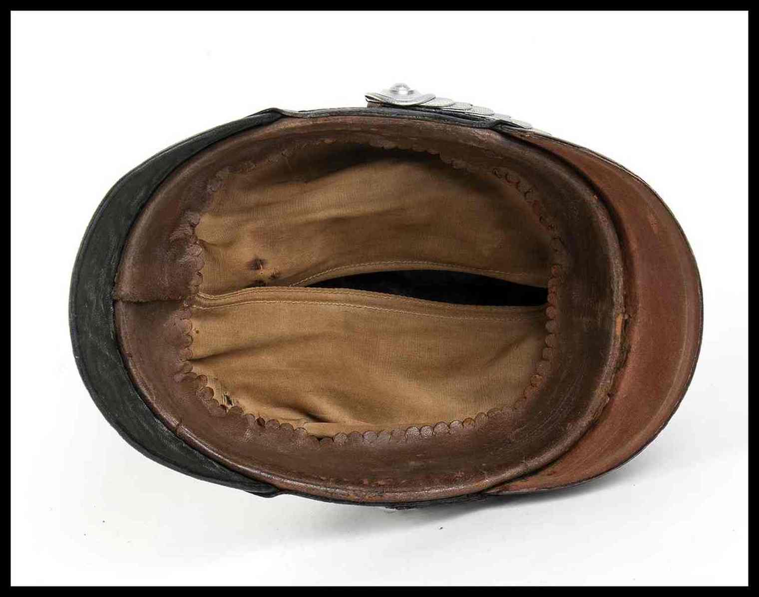 corpo rigido in fibra ricoperto di panno , aquila e soggoli in alluminio, coccarda di cordone e grovigliola metallica, interno con alluda di pelle e cuffia