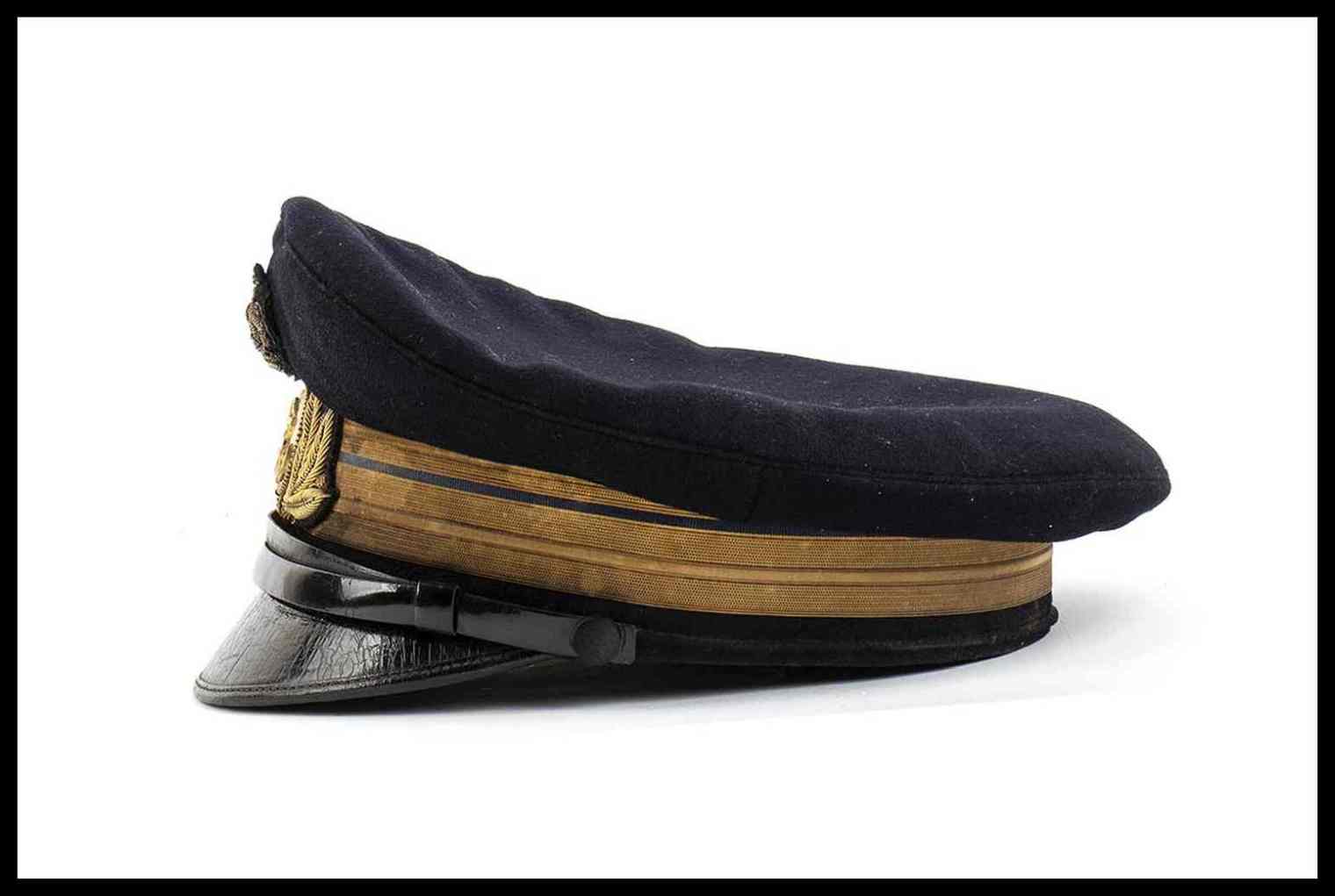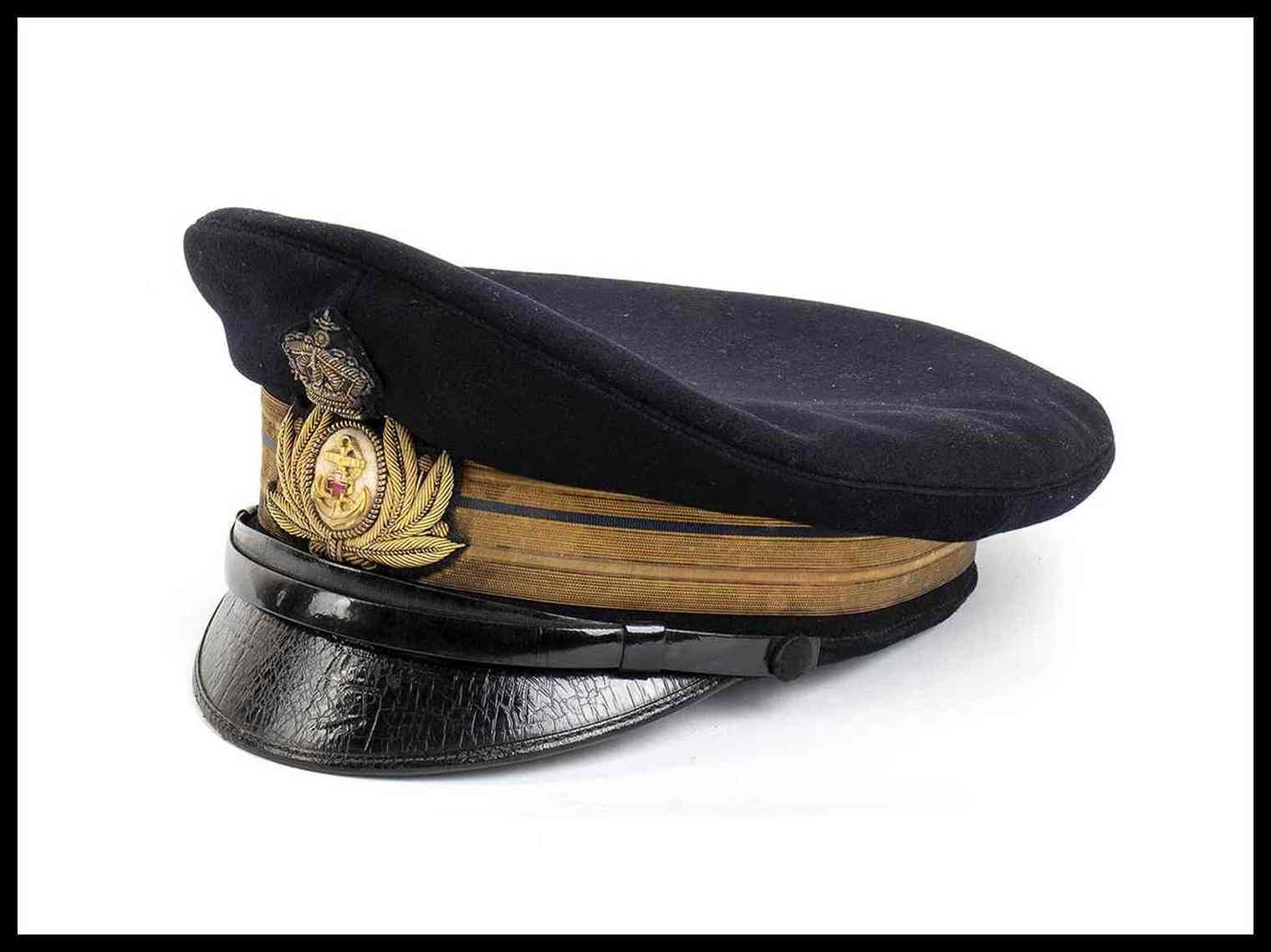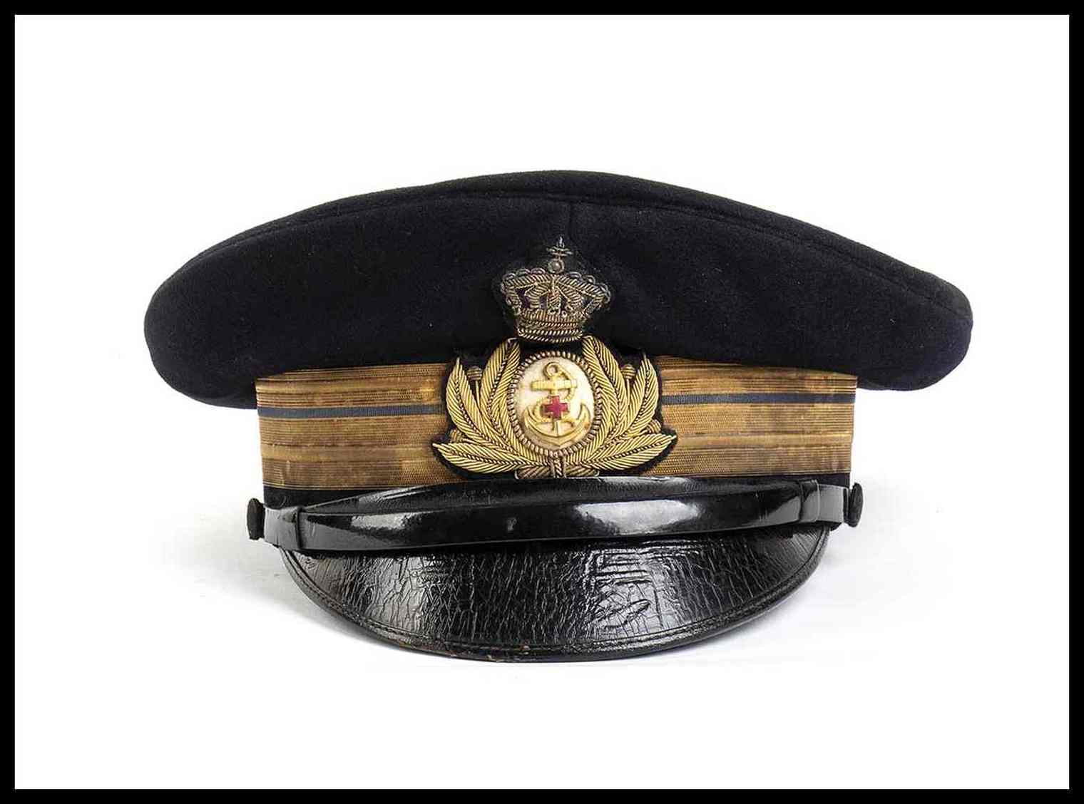 In panno di lana blu scuro, visiera piccola e spiovente, grado a lastra metallica profilato di blu, bel fregio di canottiglia con ovale bianco caricato di ancoretta con croce rossa a smalto