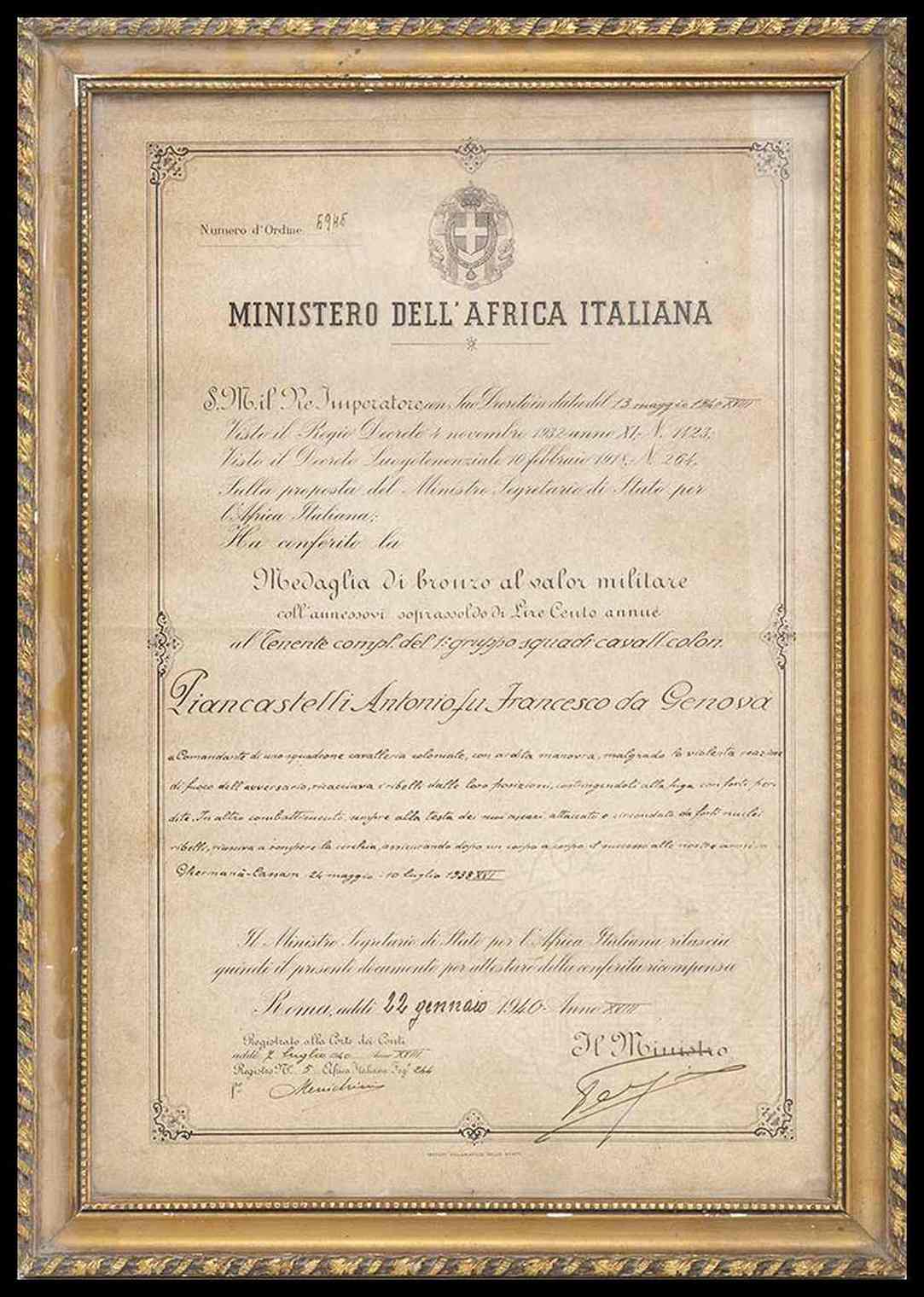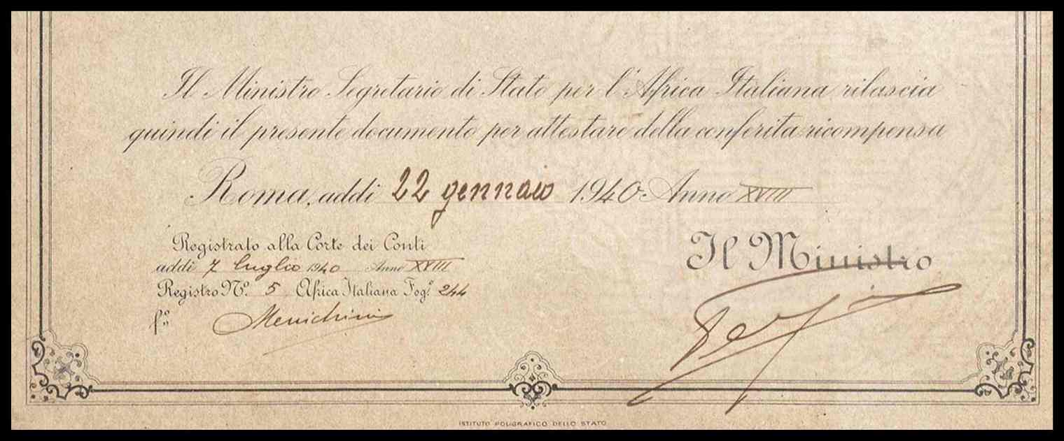 concesso ad un tenente del I gruppo squadroni cavaleria coloniale nel maggio di 1938, conservato in cornice, interessante, ottimo stato