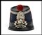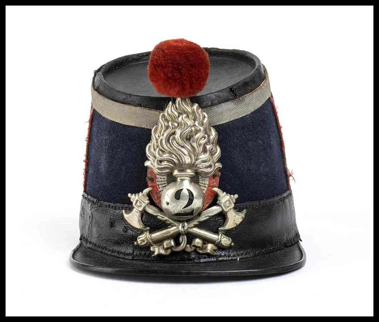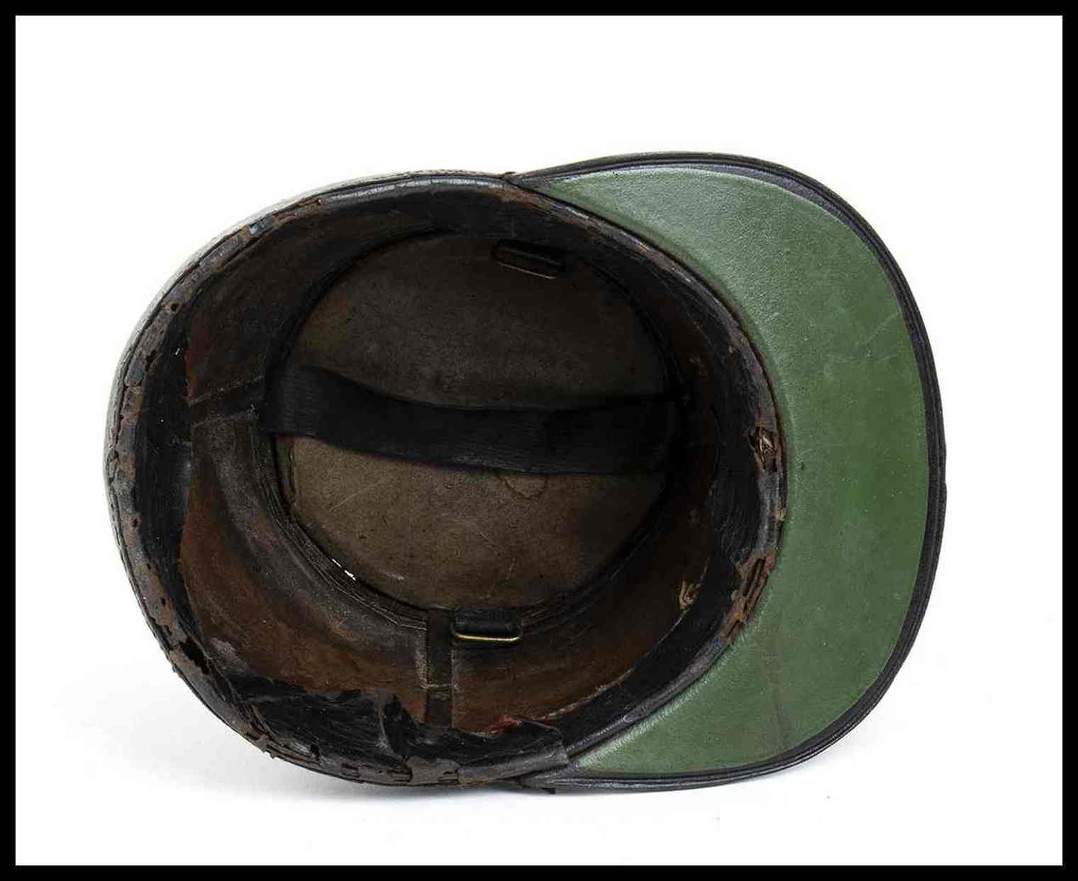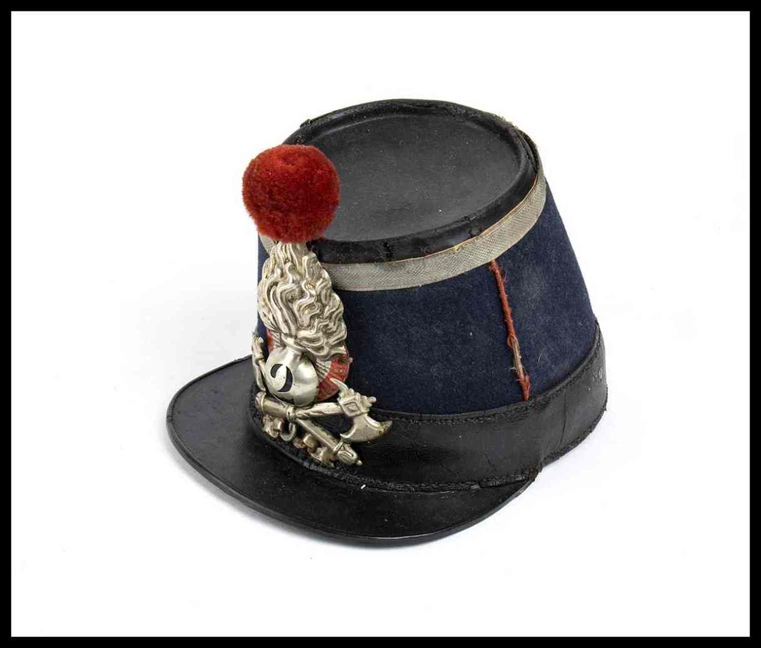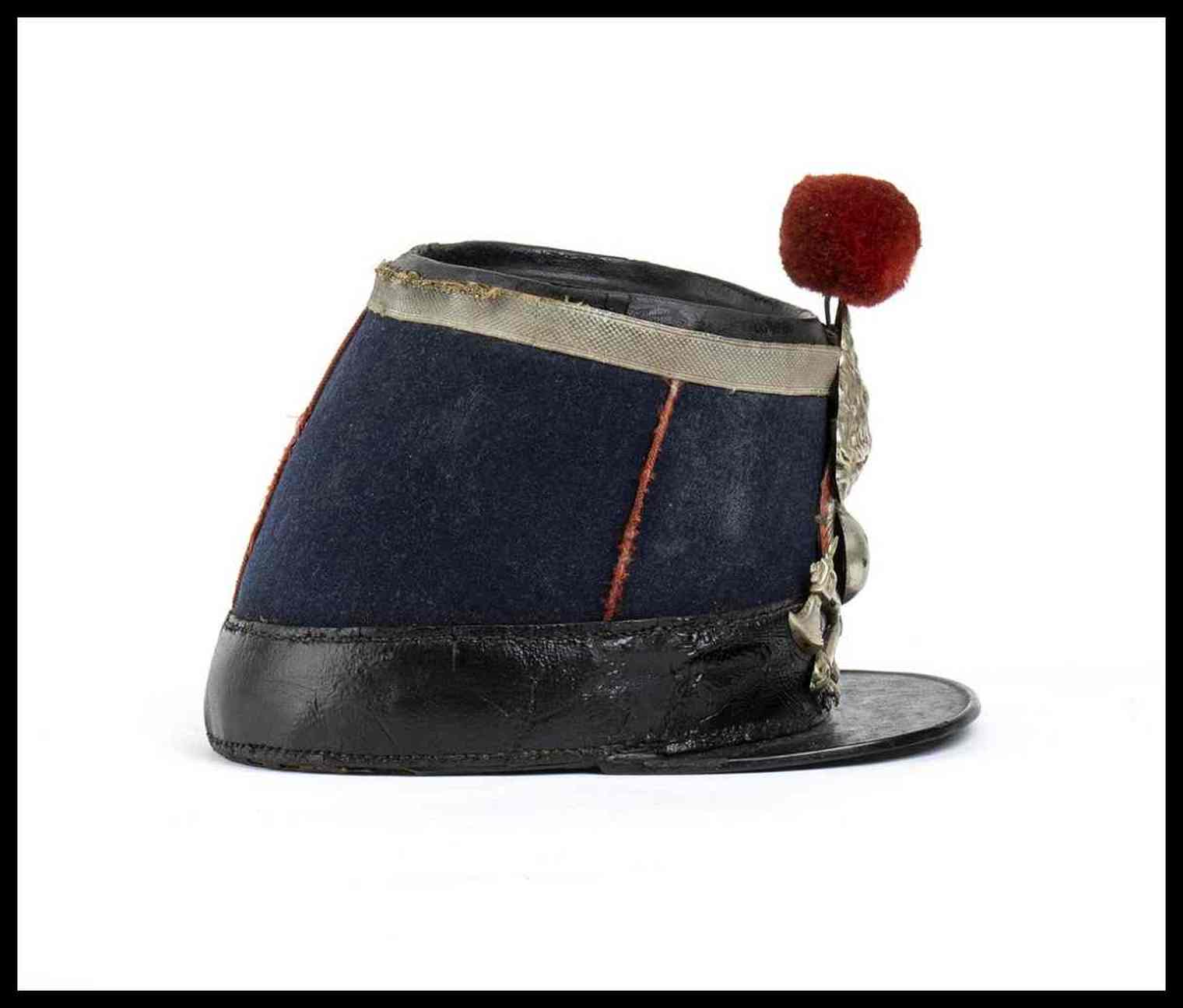 fusto rigido in cuoi rinforzato di ferro ricoperto di panno di lana, imperiale in cuoio, grado da sottoufficiale in damina d'argento, cocarda metallica e nappina di lana rossa, buono stato
