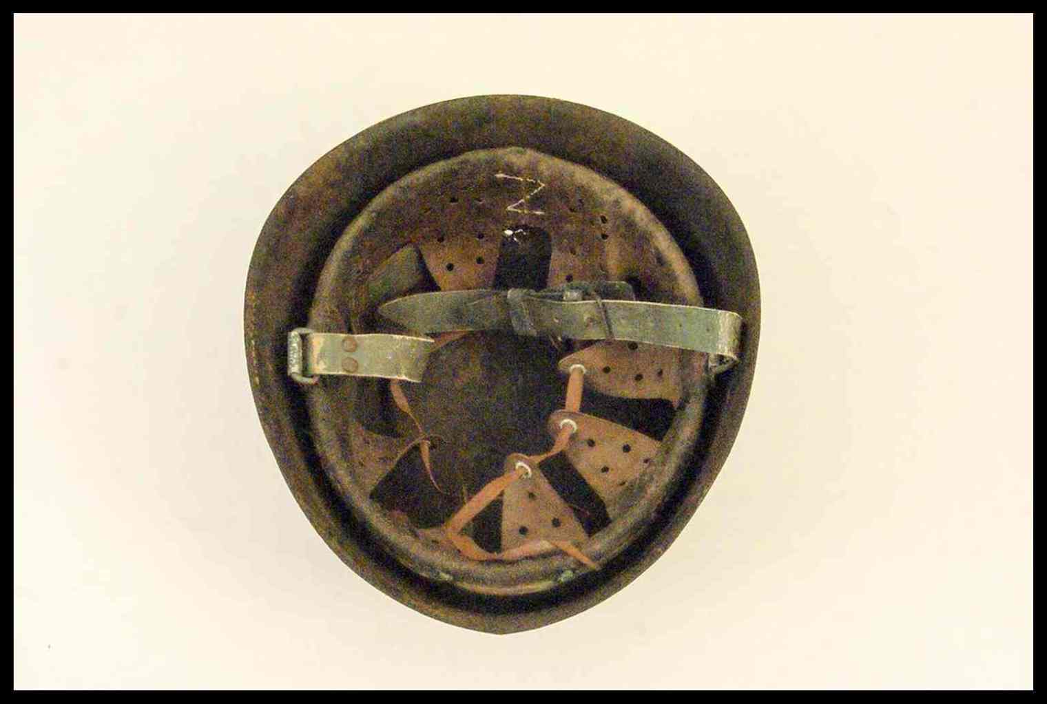 Coppo in acciaio tinto di nero con fregio dell’arma argentato, interno di pelle sagomata a dente di lupo.