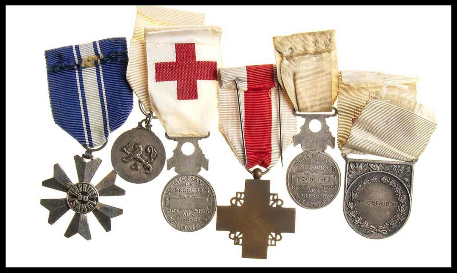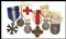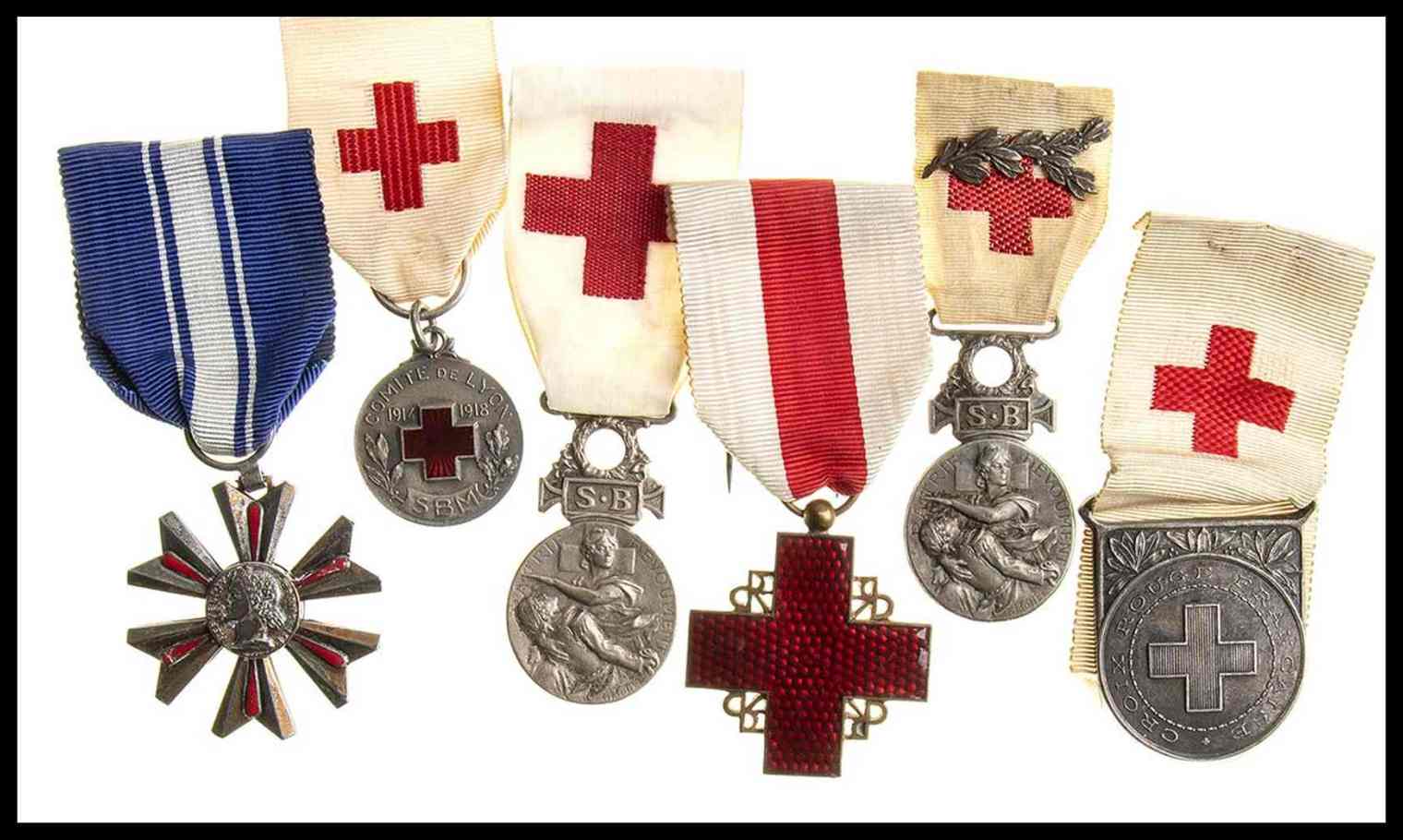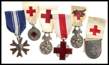 lotto di una croce in smalto ed una medaglia della crf, periodo grande guerra, due medaglie di societa’ di soccorso ed una al merito per donatori di sangue, alcune assegnate con nome del decorato, nastri originali