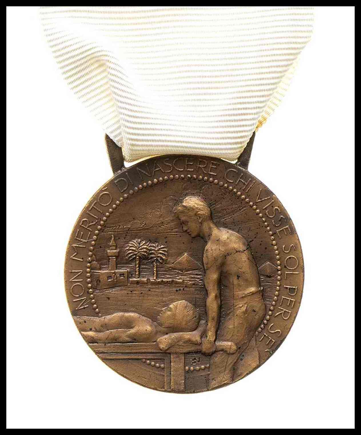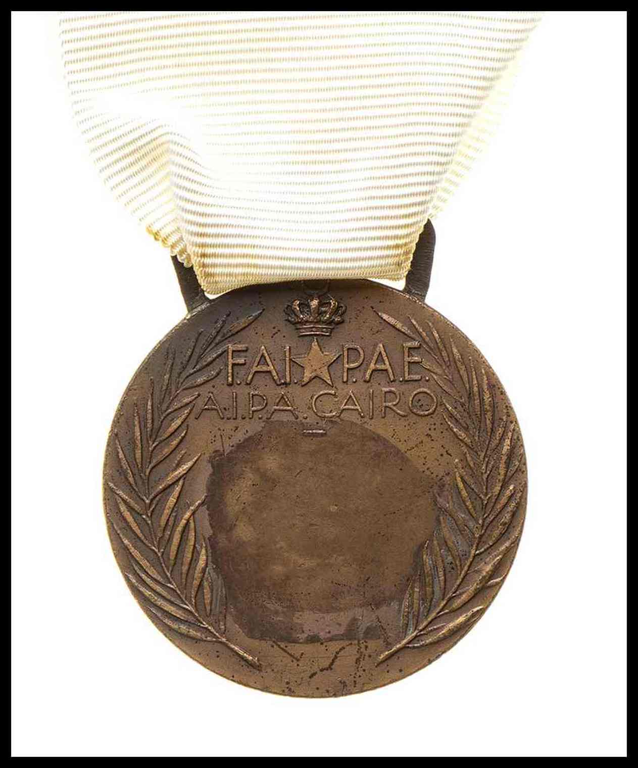 medaglia in bronzo per la croce rossa italiana al cairo, al verso fai-pae sotto corona fra tralci di palma, nastro non originale