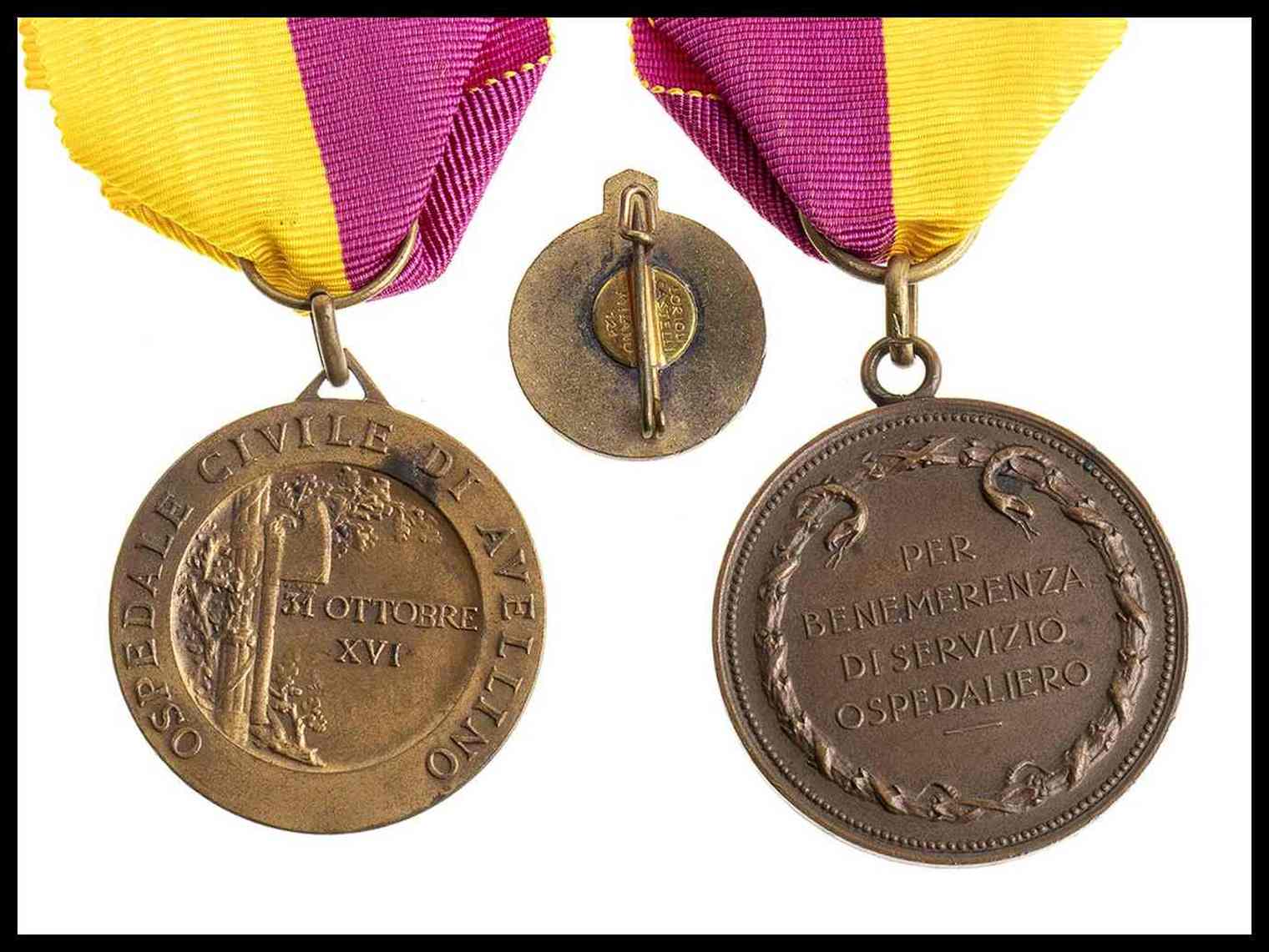 una medaglia di benemerenza ospedaliera degli ospedali riuniti di roma, una dell'ospedale di avellino, entrambe con fasci littori, ed un distintivo