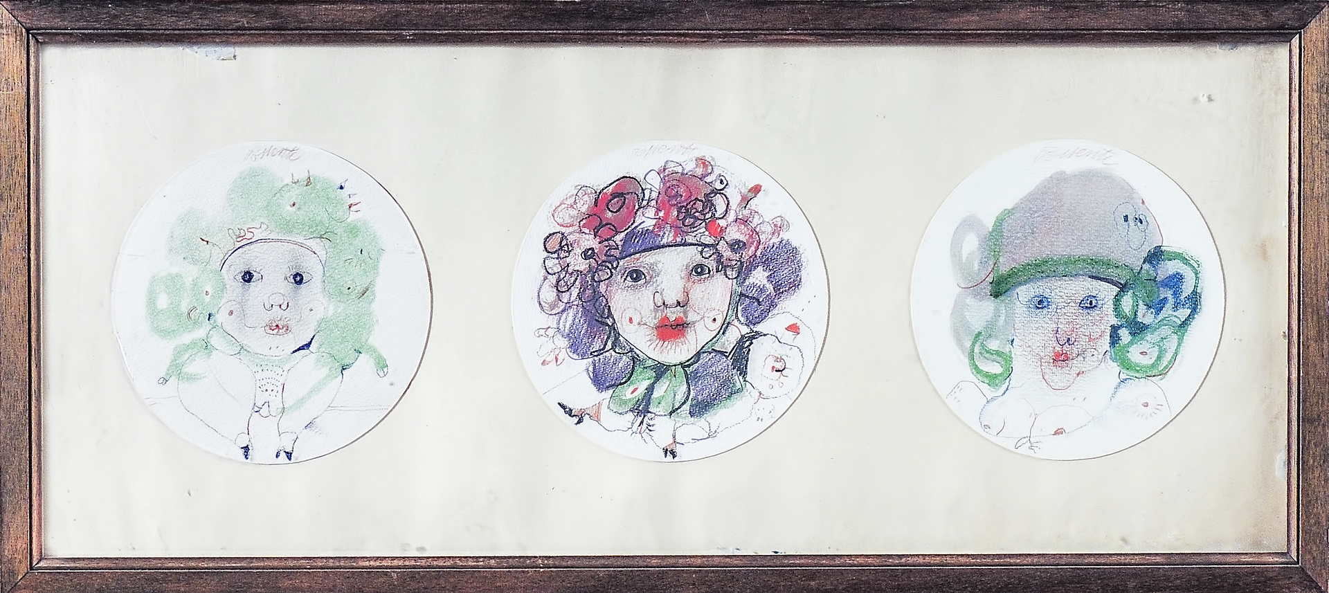 ANTONIO POSSENTI Figure serie di tre disegni a tecnica mista su cartoncino in tondo, firmati, in un'unica cornice diam cm 14,5