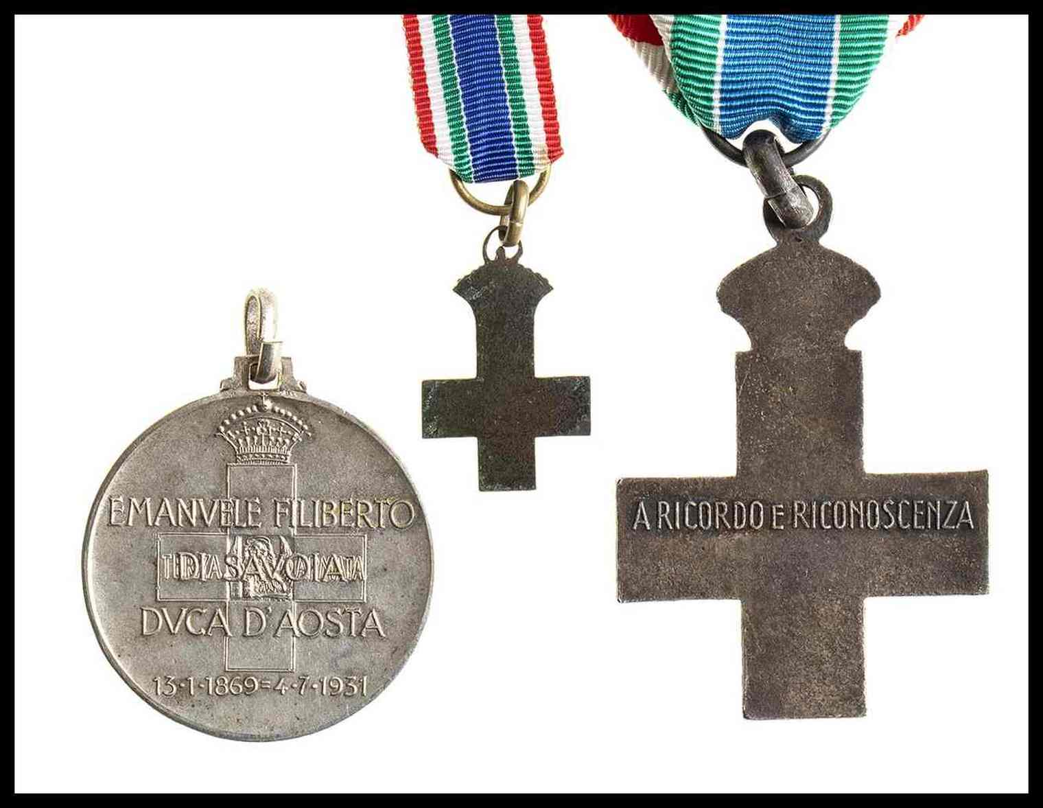 medaglia commemortiva la morte del duca emanuele filiberto duca d’aosta, comandante la terza armata durante la grande guerra, una croce della terza armata di fattura anonima con smalti a fuoco ed una miniatura della croce