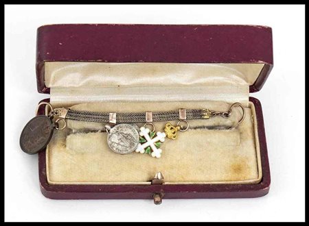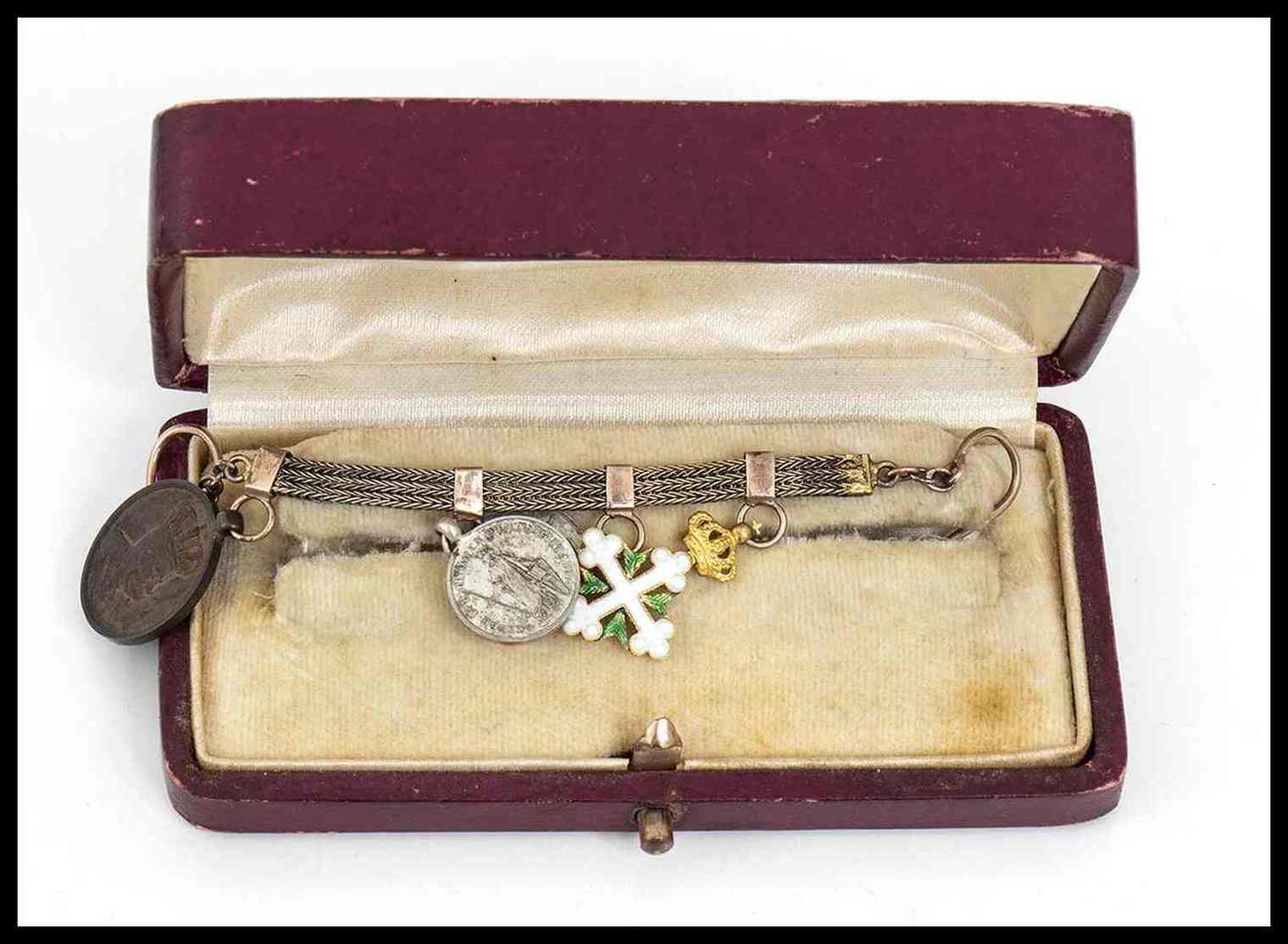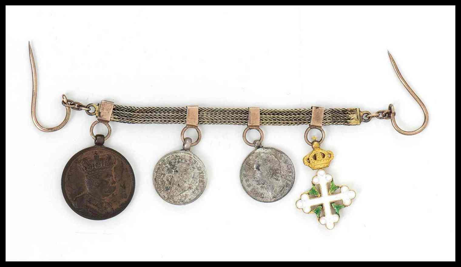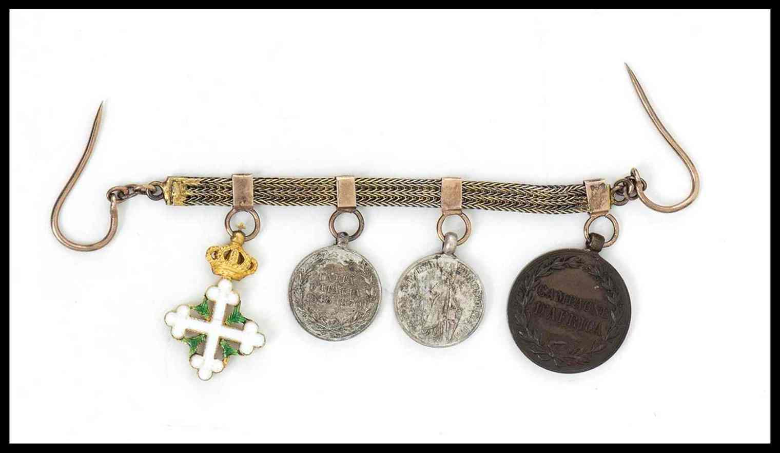 oro, argento, bronzo, lunghezza cm 6 7 gr. totali, bella catenella con miniature della commenda dei SS Maurizio e Lazzaro, unità d'Italia 1870, indipendenza e unità d'Italia, campagne d'Africa, conservata in astuccio, ottimo stato