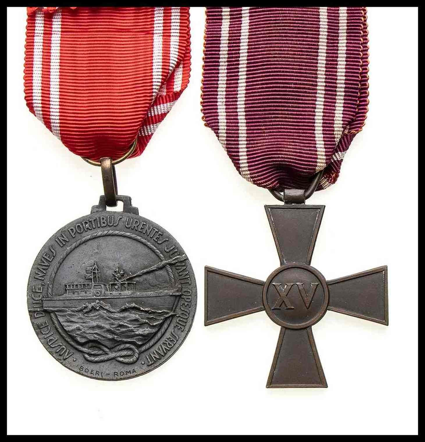 lotto di due medaglie dei vigili del fuoco, una dei navigli antincendio ed una croce per quindici anni di servizio periodo prima repubblica, nastri originali.