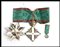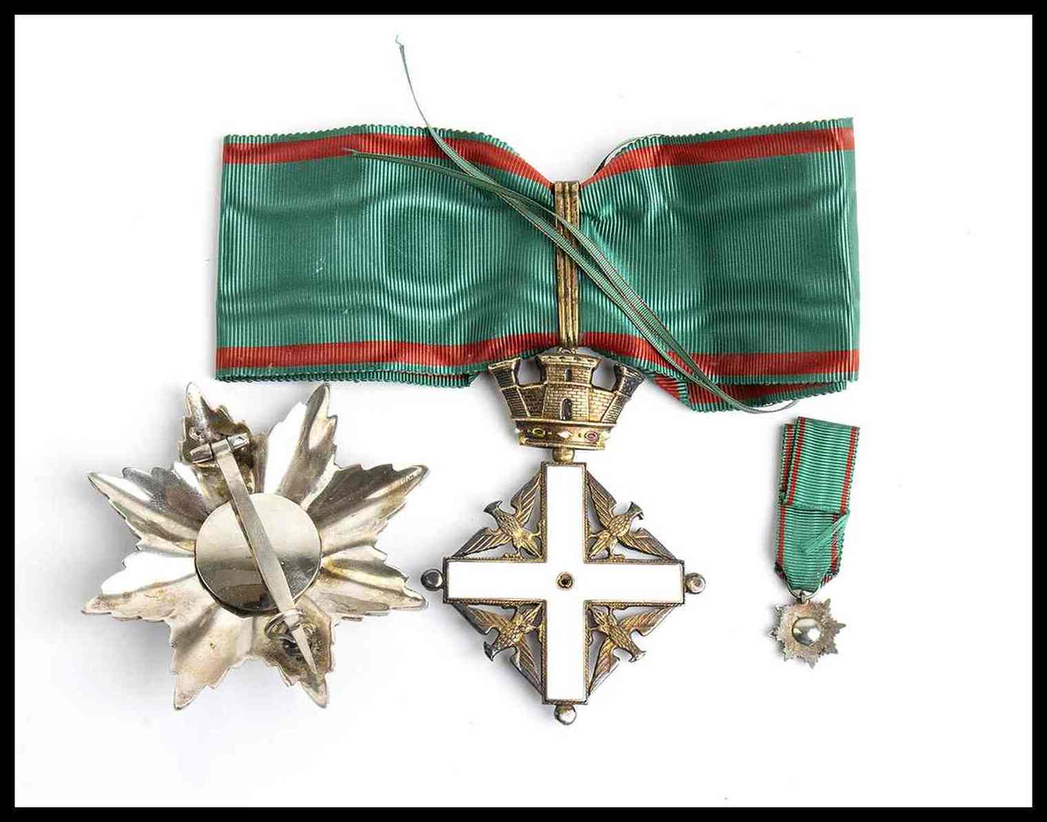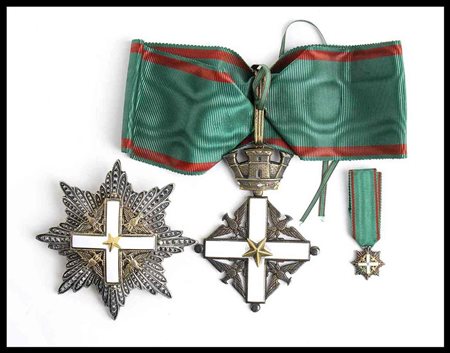 Set composta da commenda, placca e miniatura in argento parzialmente dorato e smalti policromi. Nastro in seta originale. Diam. placca 73.8 mm, commenda 57.4 mm. Buona stato.