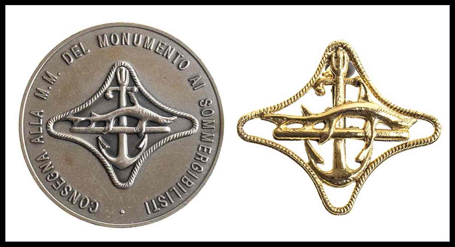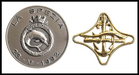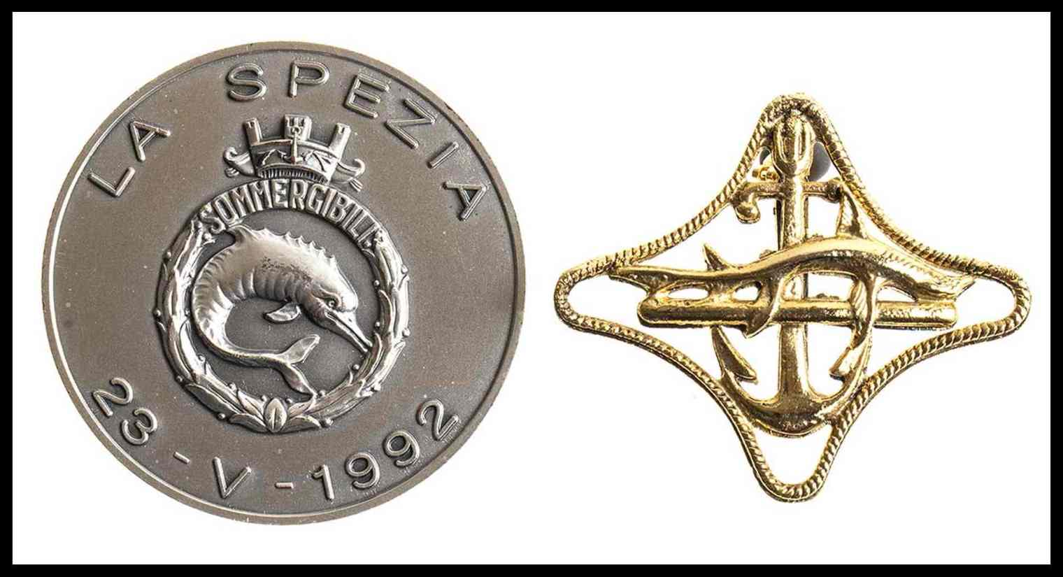 medaglia non portativa coniata in occasione della consegna alla mm del monumento ai sommergibilisti di la spezia ed un distintivo per sommergibilista, anni 90 xx sec.
