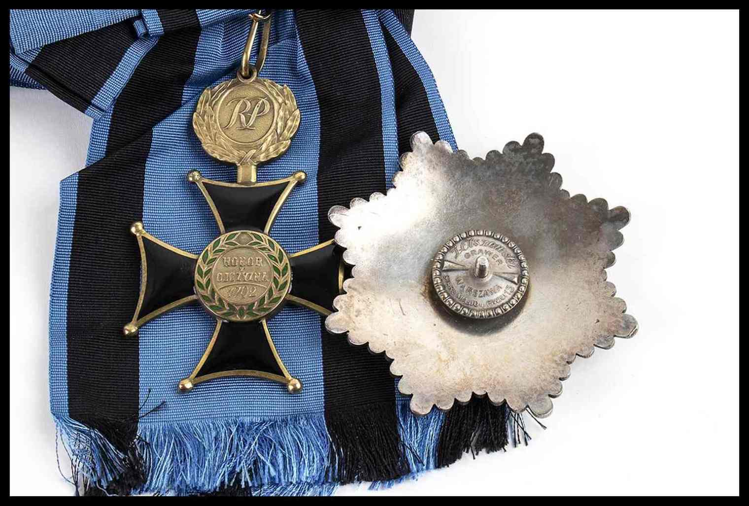 bell’insegna di gran croce di fattura post bellica ma di grande qualita’. placca in bronzo o rame argentato caricata di croce in smalto nero, al verso vite con placca marcata del fabbricante zolszewski varsavia, pendente con sigla rp su croce in smalto nero e verde, nastro non coevo. anni 50 circa