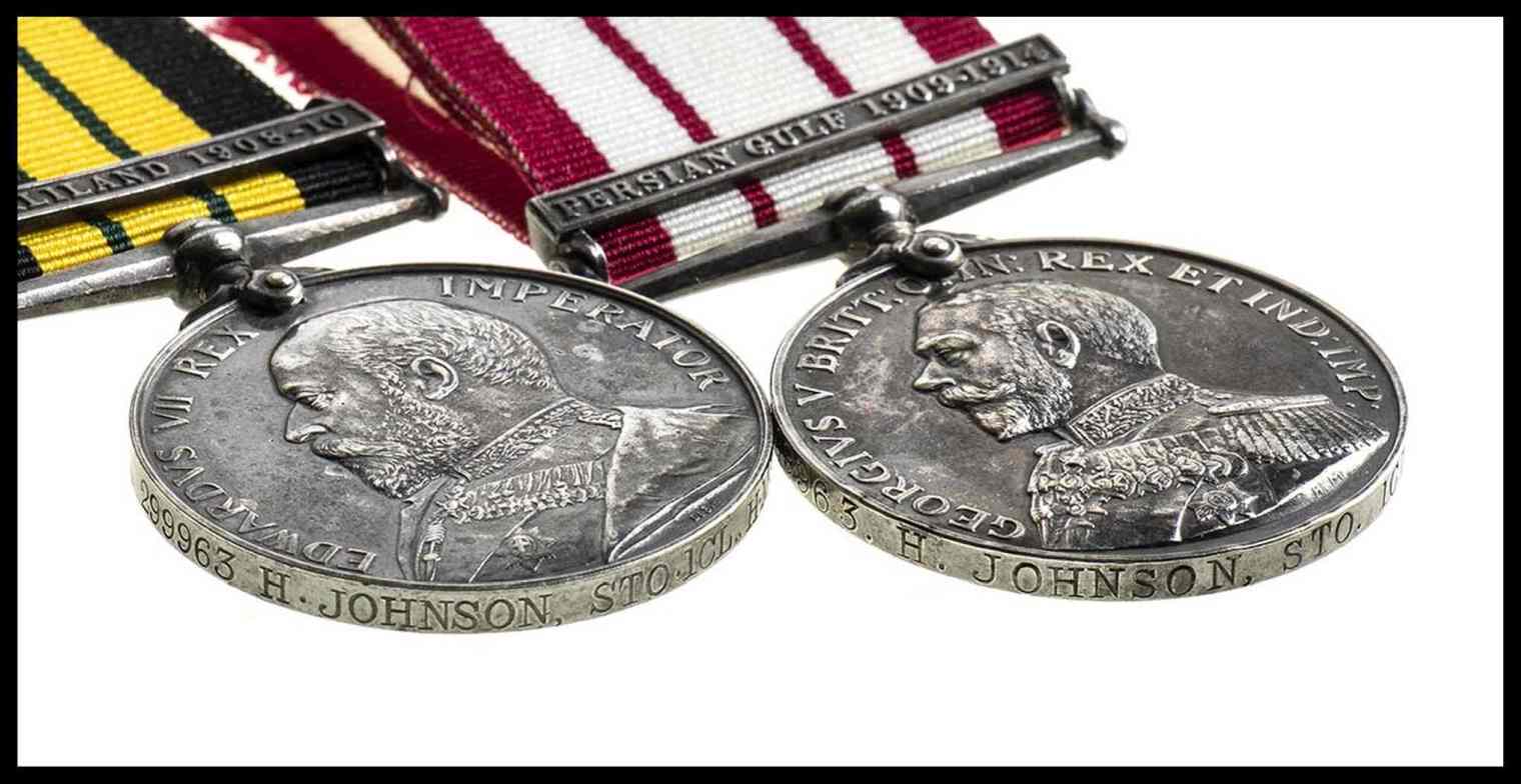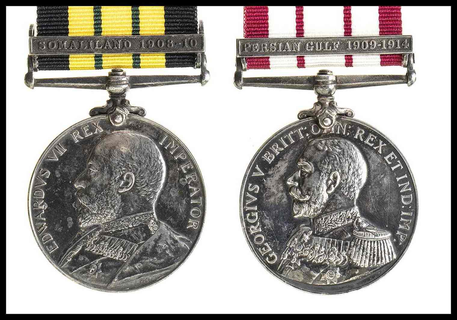 lotto di due medaglie, naval general service giorgio v con barretta persian gulf 1909-1914 e africa service medal edoardo vii con barretta somaliland 1908-10, attribuite alla stessa persona, m. jhonson sto 1 cl hsm hyacint