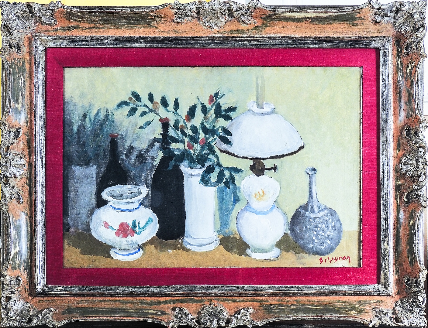 GUIDO PEYRON (1898-1960) Natura morta con vasi e lume olio su tela, firmato, in cornice cm 45x65 Al verso reca timbro "Galleria Santacroce Firenze", n° 3331