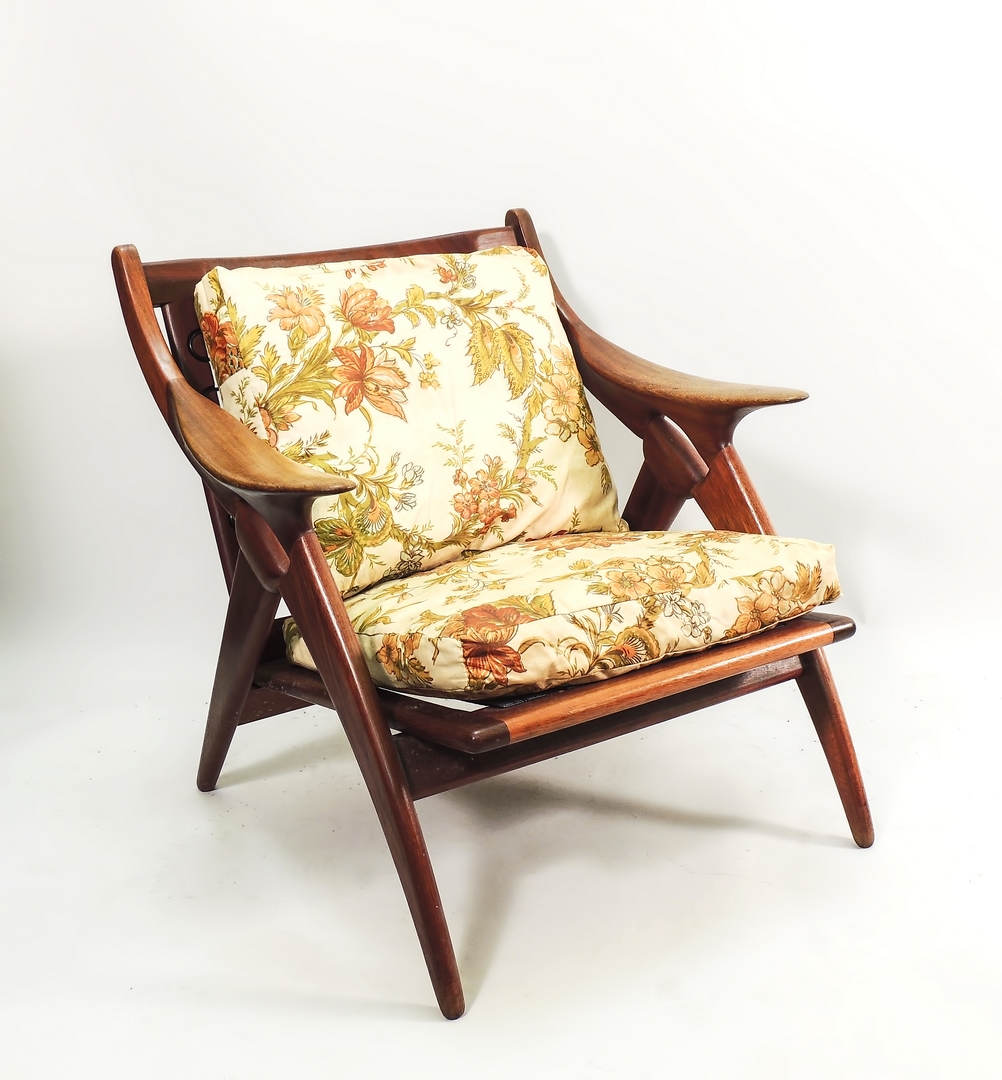 COPPIA DI POLTRONE IN TEK Anni Cinquanta con cuscini rivestiti in tessuto...