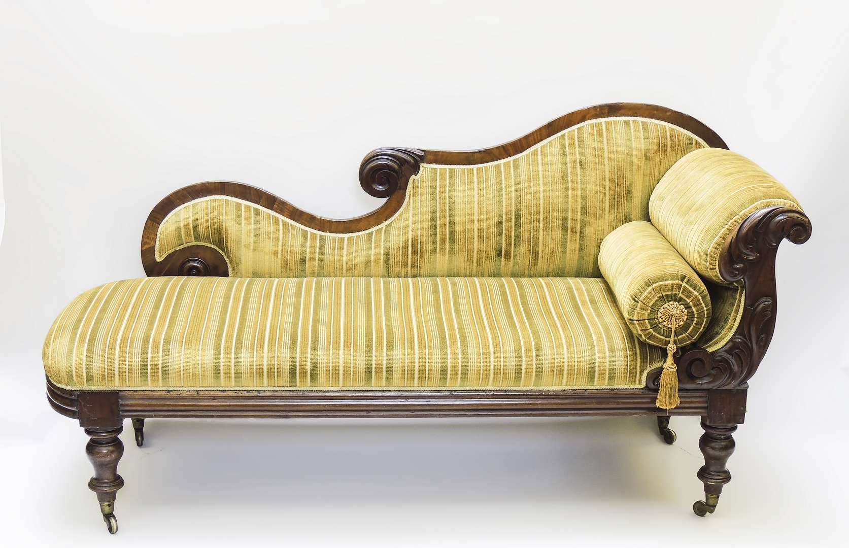 DORMEUSE IN MOGANO E PIUMA DI MOGANO seconda metà del XIX secolo schienale e braccioli intagliati con finali a ricciolo, piedi torniti, rivestita in velluto rigato color senape, corredata da cuscino a rullo h cm 96x178x60