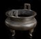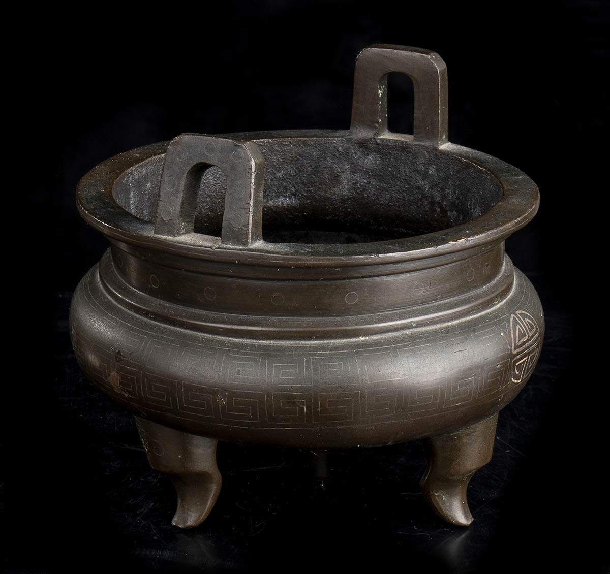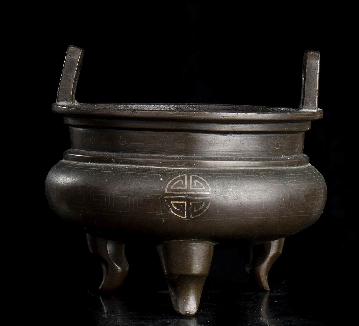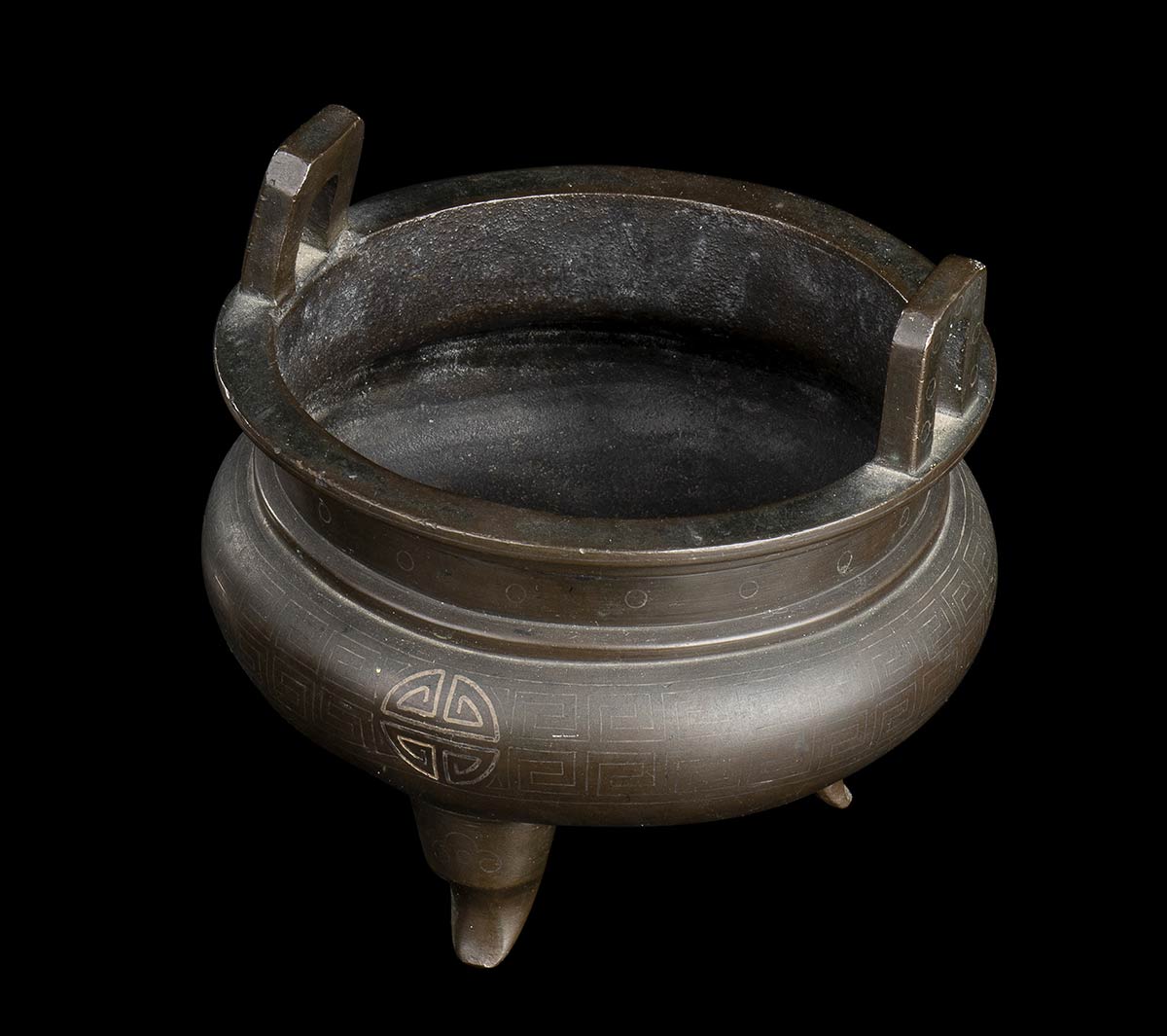 A sezione circolare, il corpo globulare compresso sostenuto da tre piedini e sormontato da ampio collo sul quale si innesta tesa della bocca con due prese, su due lati del corpo il carattere shou a intarsio di argento, marchio Shisou al centro della base.