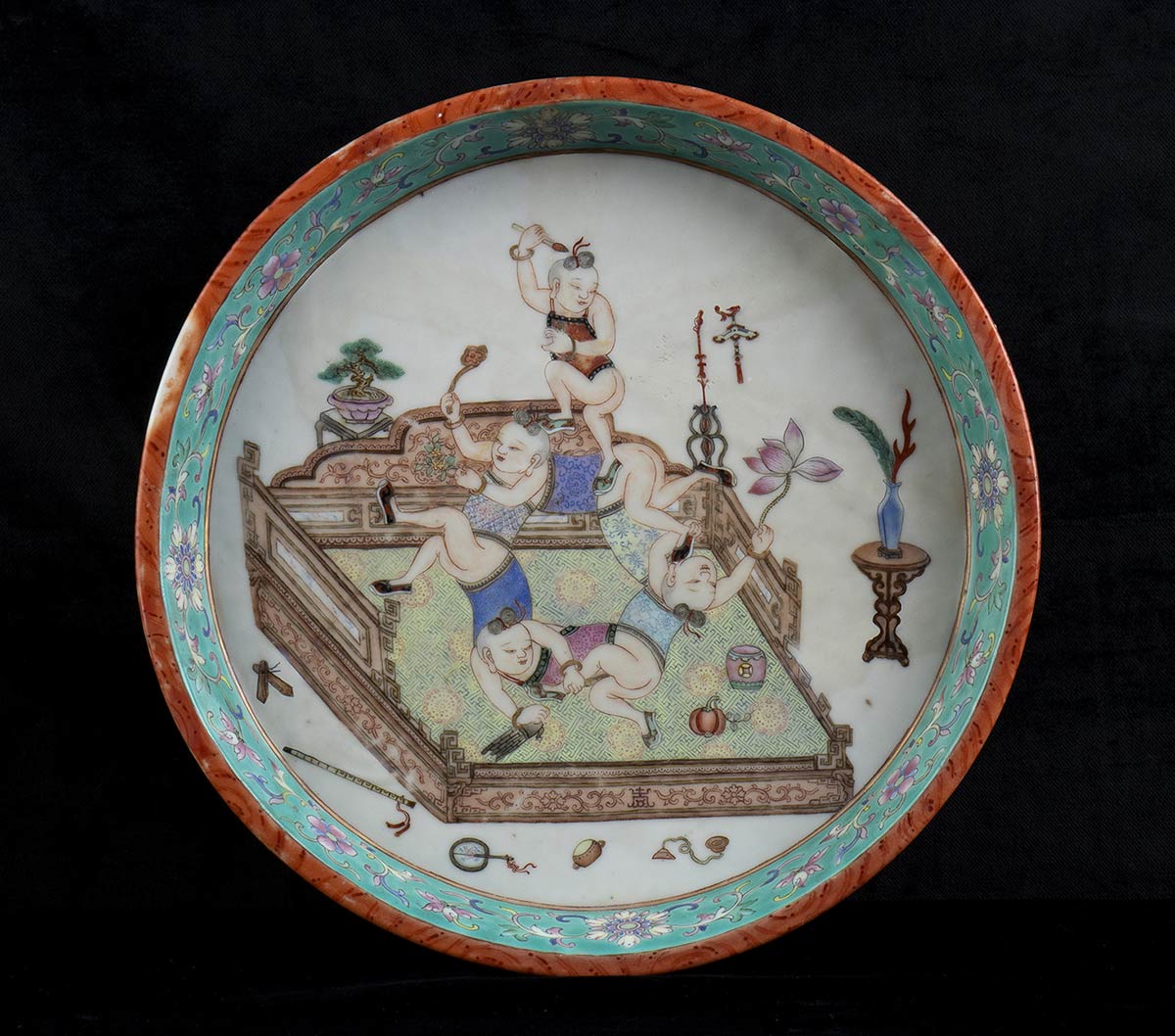 A sezione circolare. con parete obliqua, presenta sul fondo una finissima decorazione con cinque bambini in atteggiamenti giocosi su un letto, ognuno con un oggetto o fiore in una mano, altri oggetti delle Cento Antichità sparsi intorno, l’interno della parete con arabesco floreale su fondo verde, l’esterno con invetriatura ‘faux bois’.