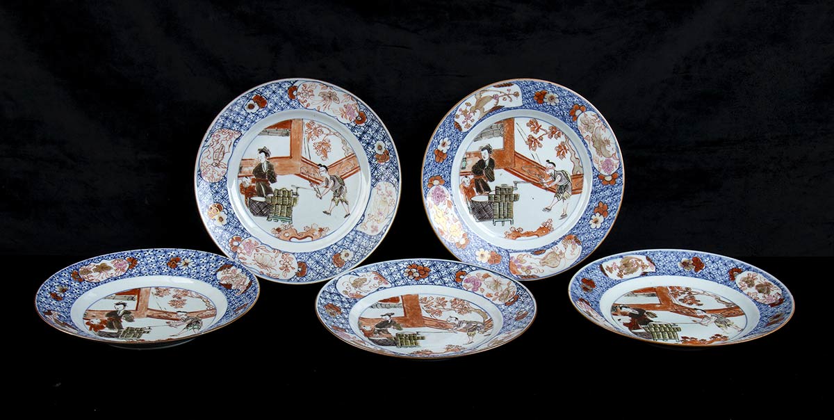CINQUE PIATTI IN PORCELLANA CON DECORO A SMALTI POLICROMI