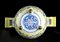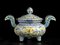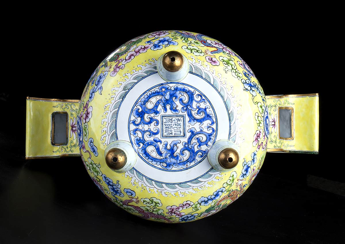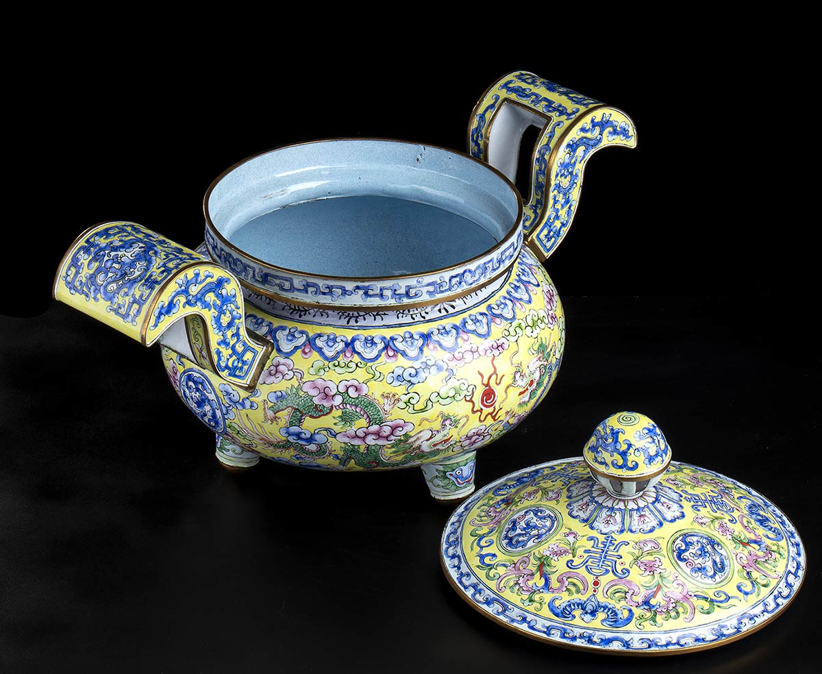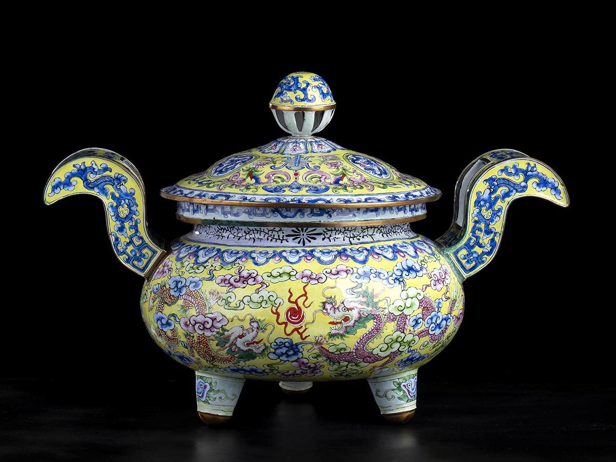 Il corpo globulare compresso sostenuto da tre piedi, due grandi prese ai lati, breve collo cilindrico e coperchio a calotta ribassata con finale sferico, la vivace decorazione policroma consiste sul corpo di draghi all’inseguimento della perla in volo tra nuvole, marchio apocrifo di Qianlong al centro della base.