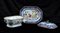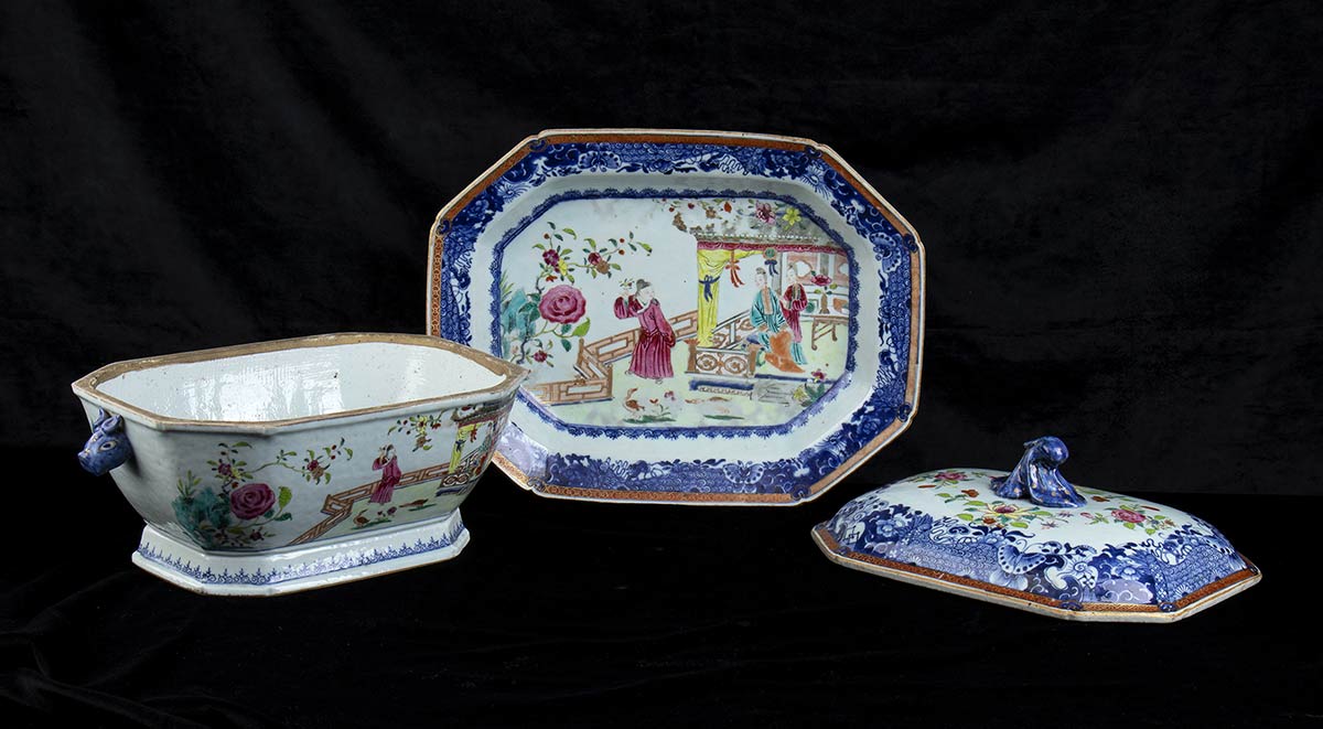I pezzi a sezione ottagonale, il contenitore con prese modellate come testa di coniglio, il coperchio con presa a fiore stilizzato, la decorazione - dipinta in blu di cobalto sotto vetrina e smalti policromi della ‘Famiglia Rosa’ - consiste sul corpo di scene affollate di personaggi e ambientate tra giardini e scorci di architetture, sul coperchio fiori, farfalle e campiture geometriche.