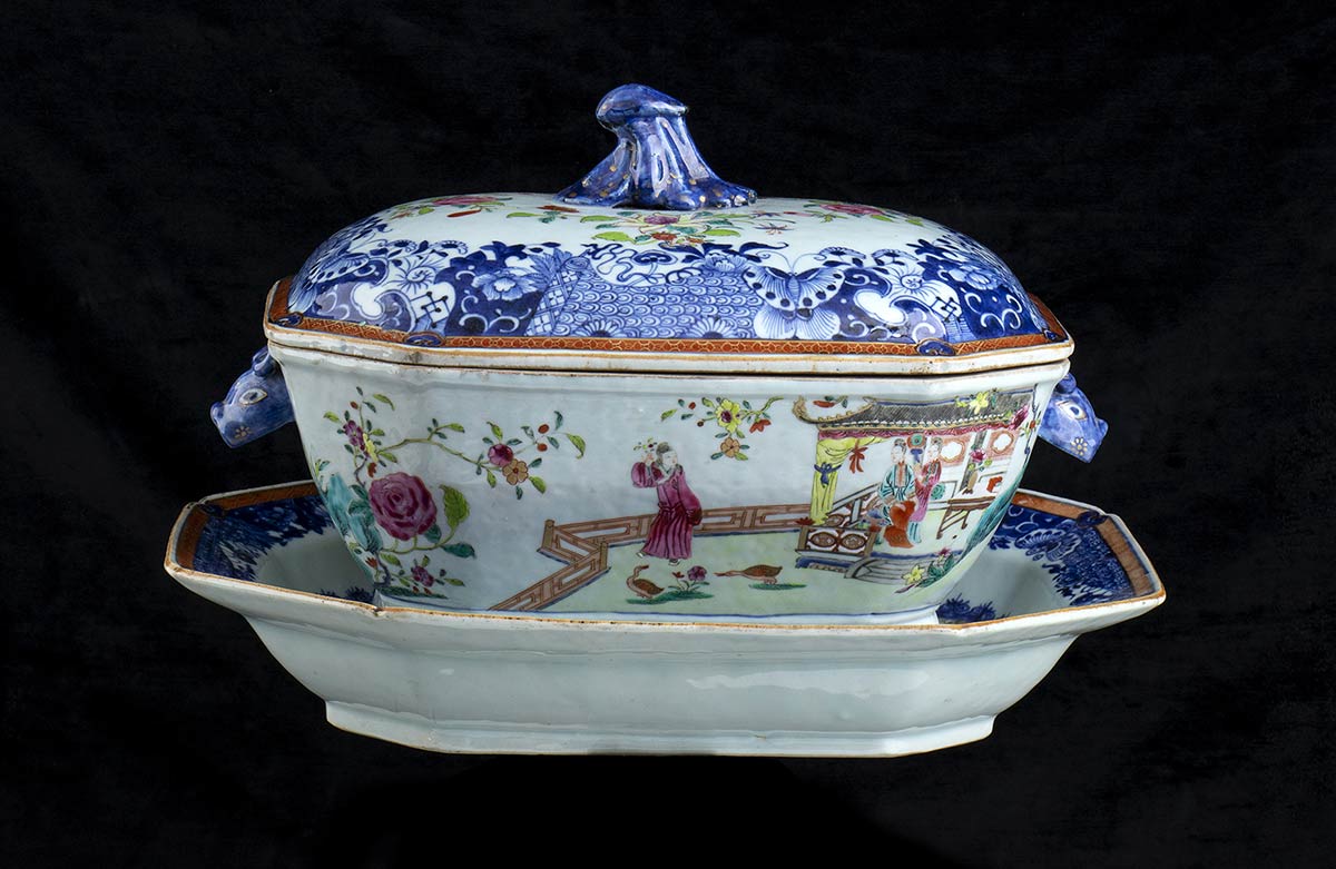 ZUPPIERA CON COPERCHIO E VASSOIO IN PORCELLANA ‘FAMIGLIA ROSA’