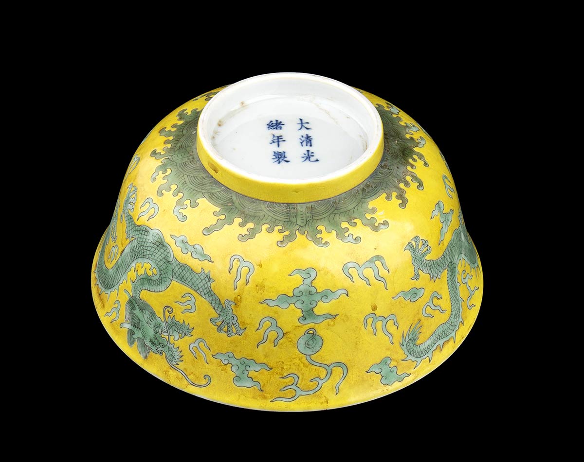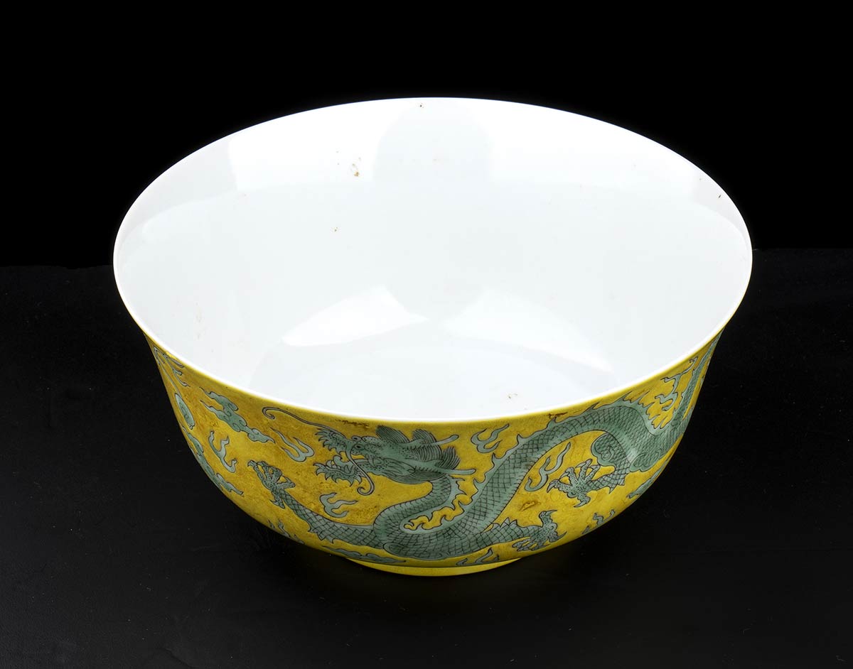 CIOTOLA IN PORCELLANA CON DECORO A SMALTI GIALLO E VERDE