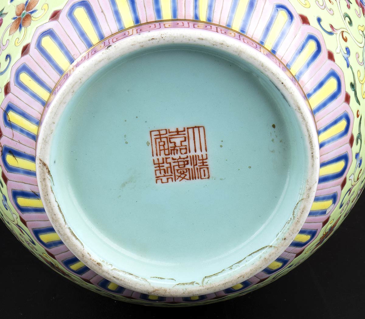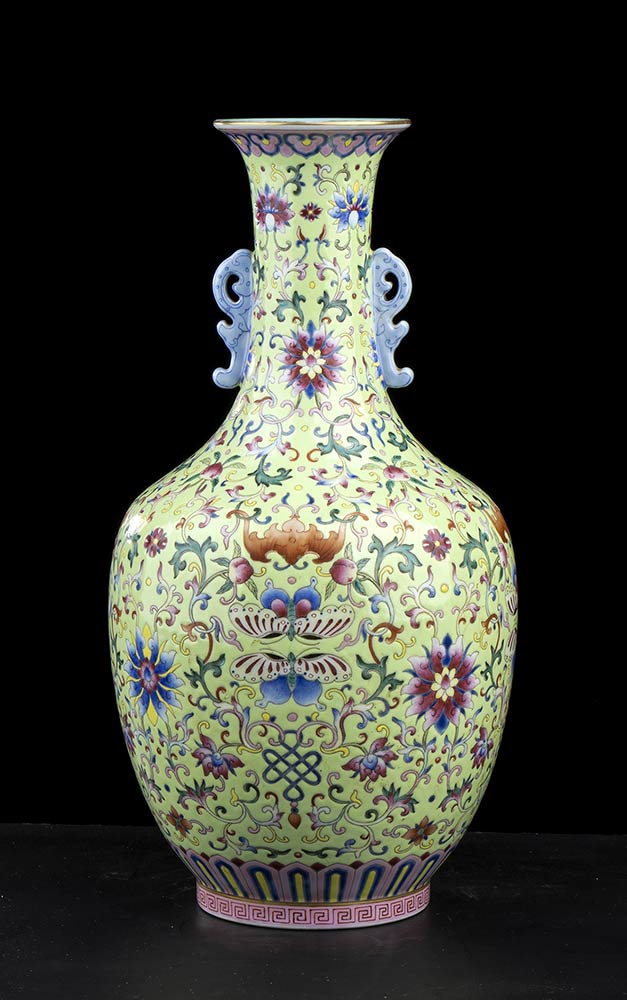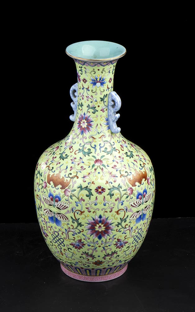 VASO A BALAUSTRO IN PORCELLANA CON DECORO A SMALTI POLICROMI SU FONDO VERDE