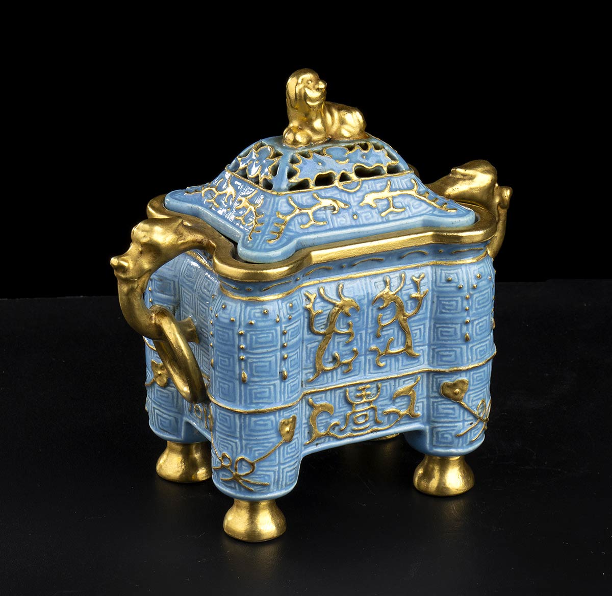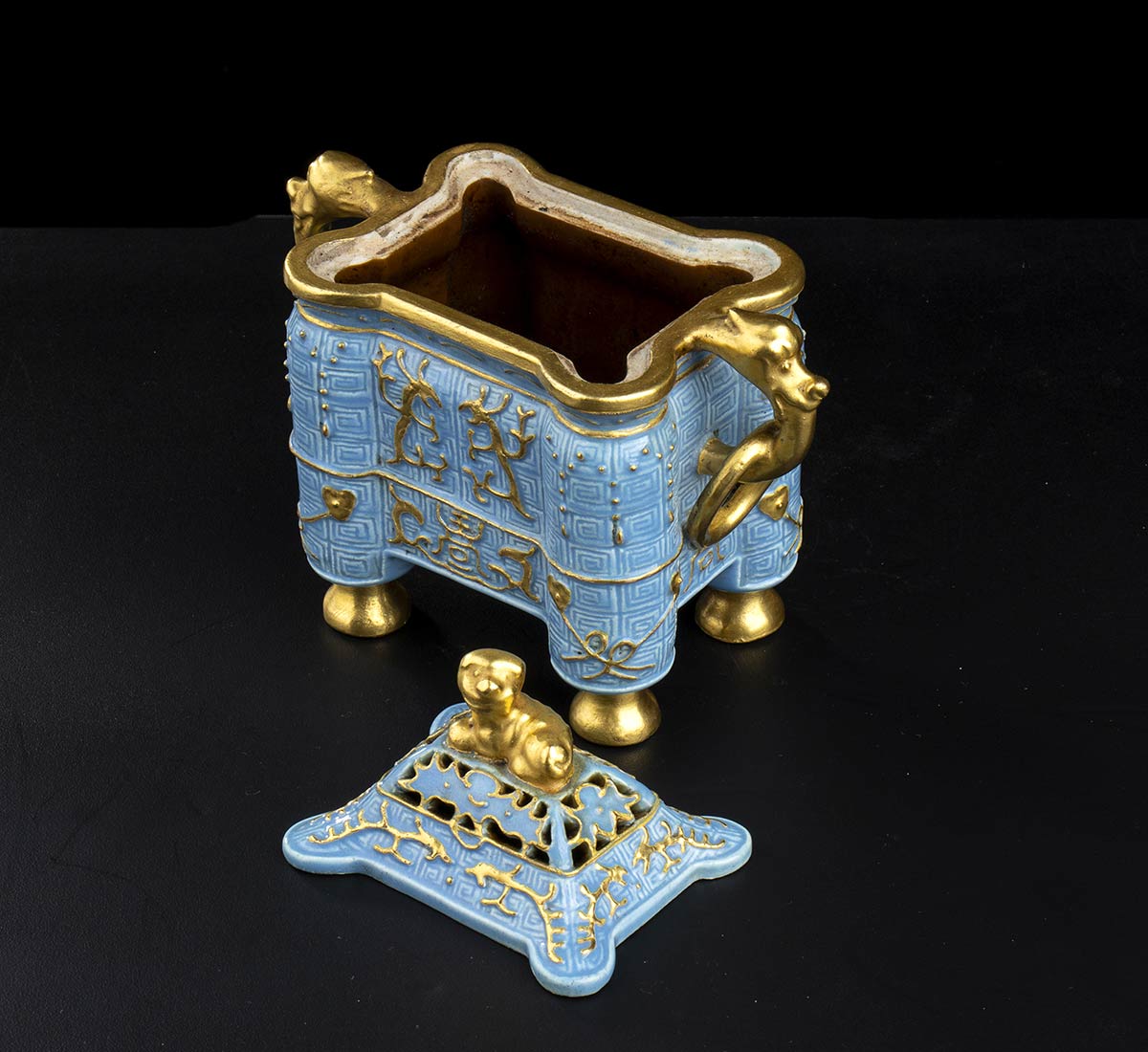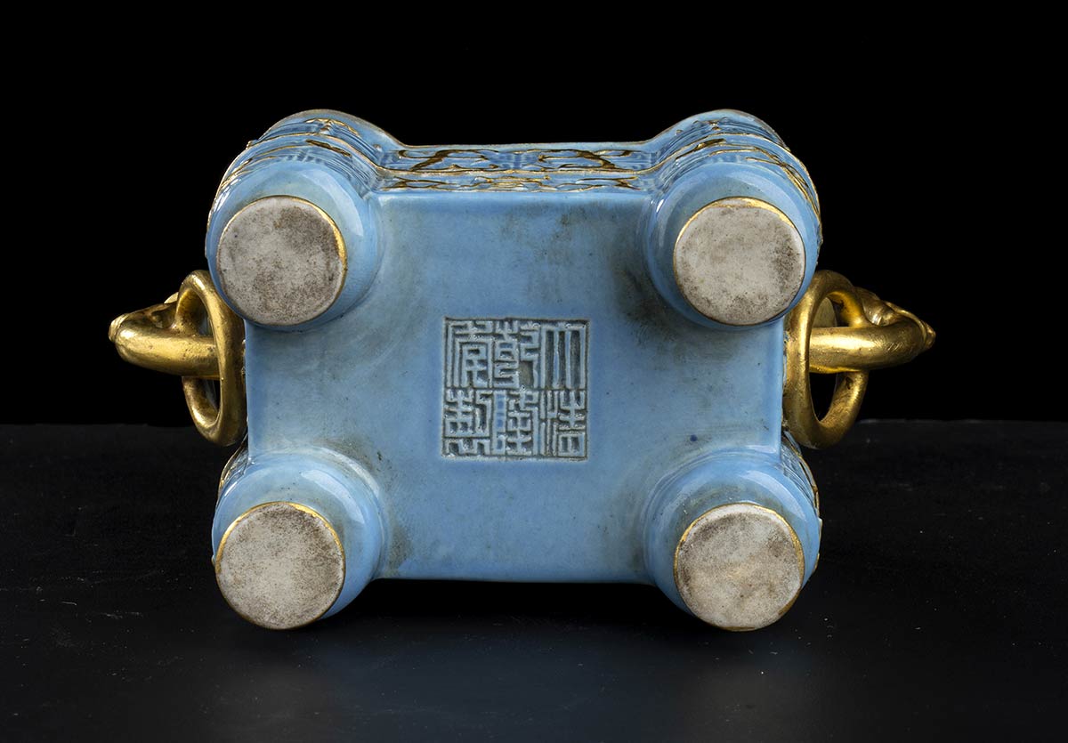 A sezione rettangolare con piedi circolari, su due lati prese a testa di animale fantastico con anello tra le fauci, coperchio a campana ribassata con finale a leone, l’esterno con tappeto di leiwen sul quale si sovrappongono draghi stilizzati a leggero rilievo e il carattere shou, “longevità”, marchio apocrifo di Qianlong al centro della base.