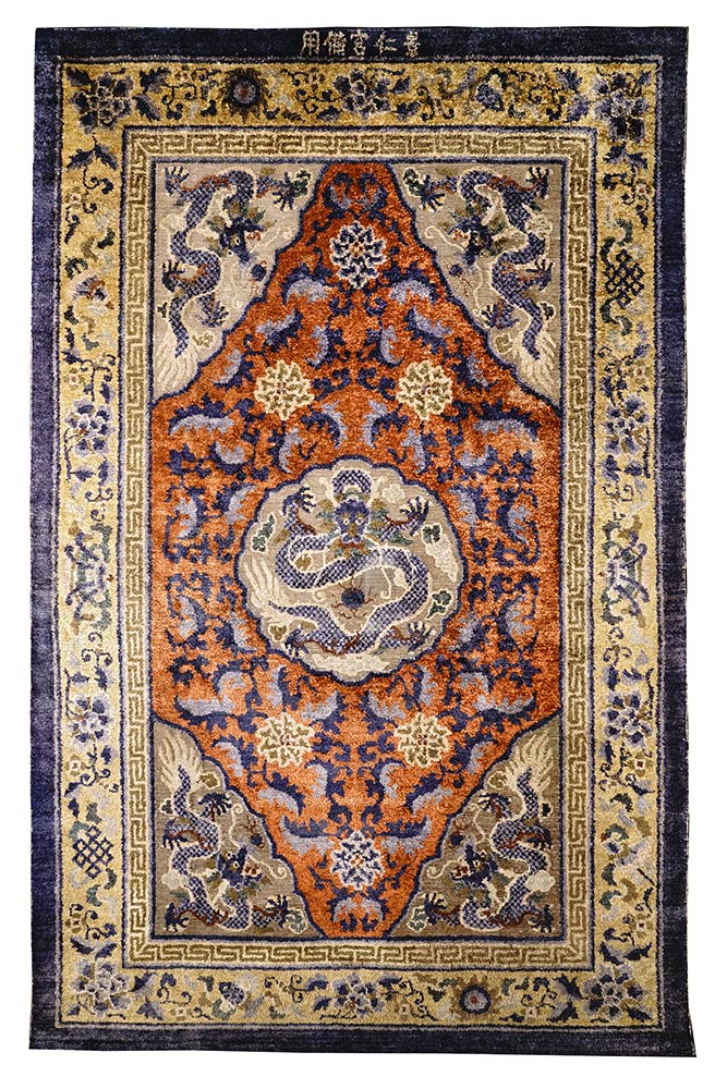 RARO E IMPORTANTE TAPPETO IMPERIALE IN SETA E FILI DI RAME DORATO CON DECORO DI DRAGHI