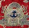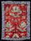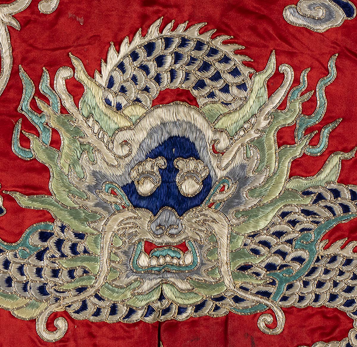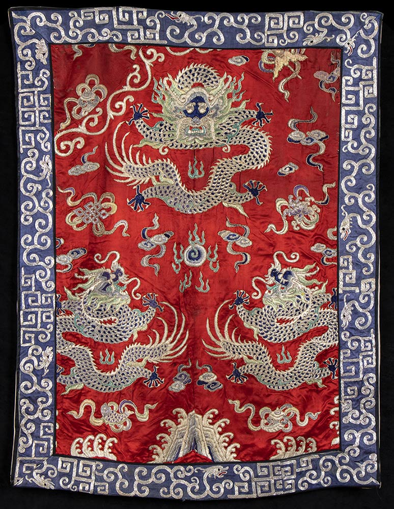 Al centro campeggia una vivace decorazione su fondo rosso con tre draghi all’inseguimento della perla in volo tra oggetti simbolici, in basso un picco montano tra onde marine stilizzate, la scena racchiusa entro cornice a fondo blu con draghi stilizzati e motivi geometrici.