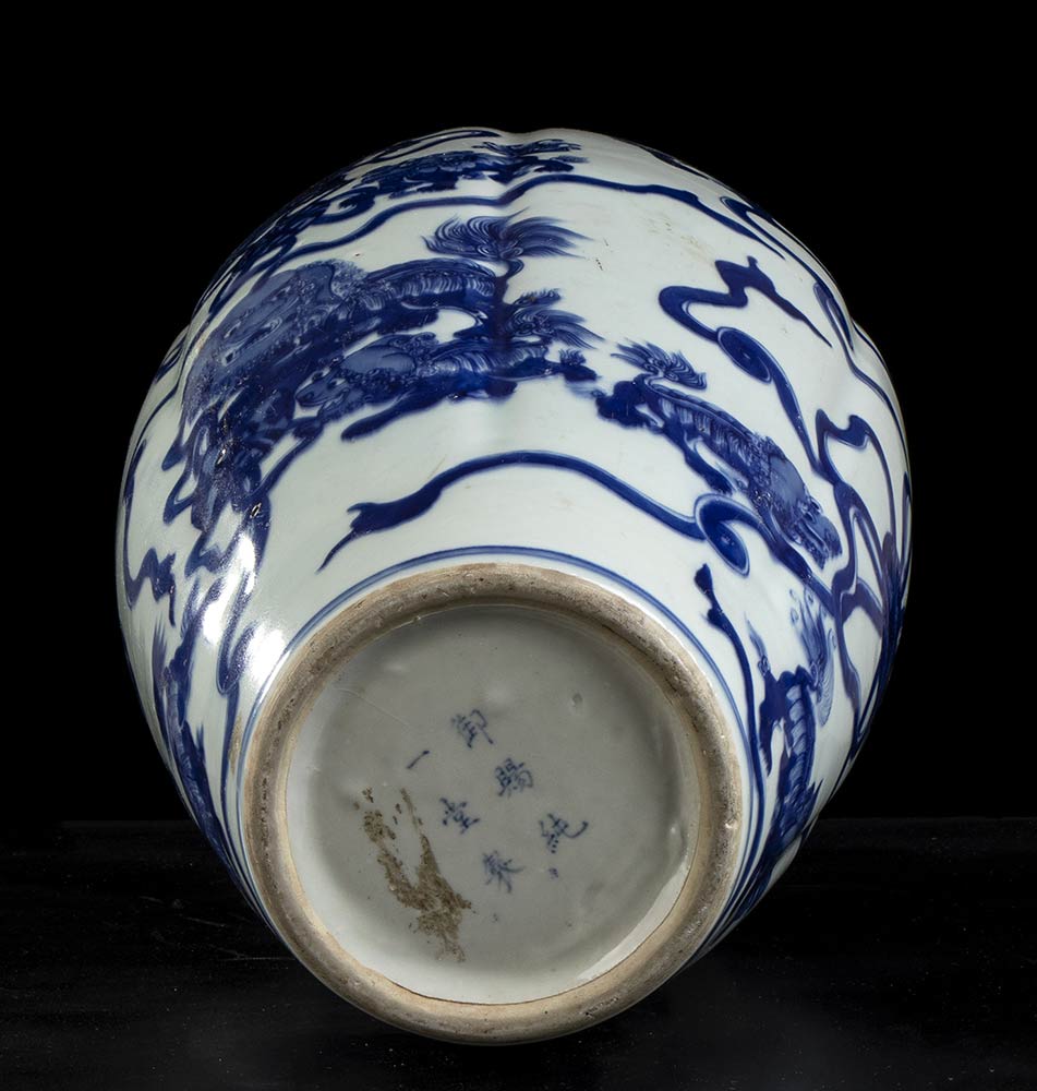 La parete modellata in accentuate lobature, la decorazione con leoni buddhisti e cuccioli tra nastri svolazzanti, marchio 御賜纯一堂製 al centro della base.