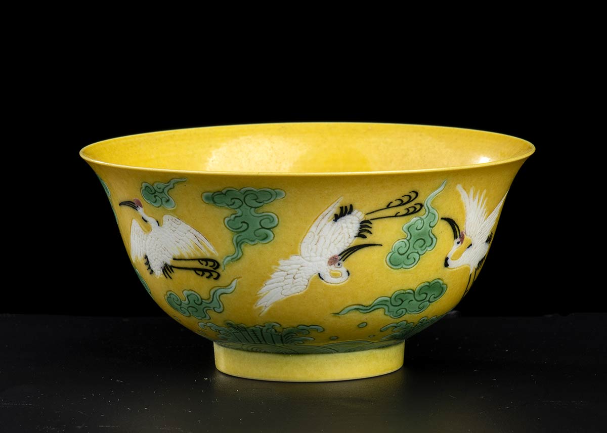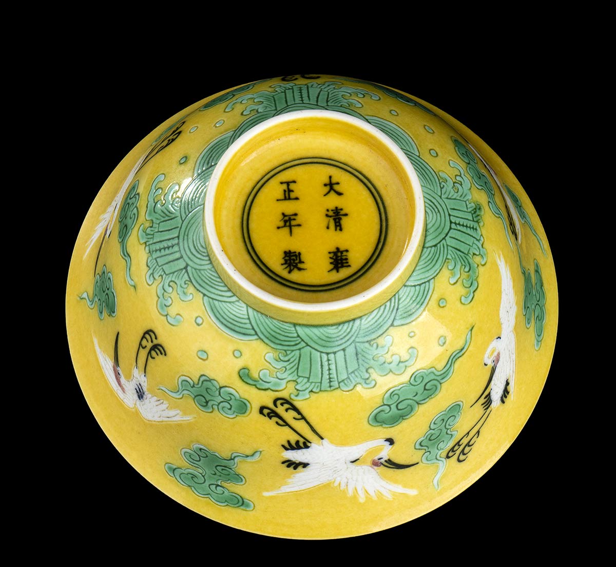 L'esterno decorato a leggero rilievo con gru in volo tra nuvole e onde, smalti policromi su fondo giallo, marchio apocrifo di Yongzheng al centro della base.