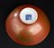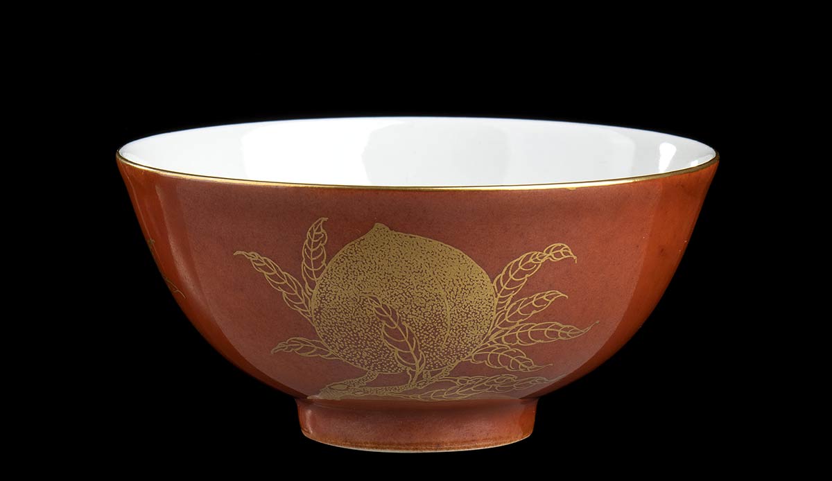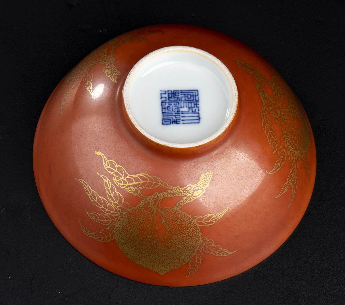 L’esterno finemente decorato con melograni e pesche a oro su fondo arancio, marchio apocrifo di Qianlong al centro della base.