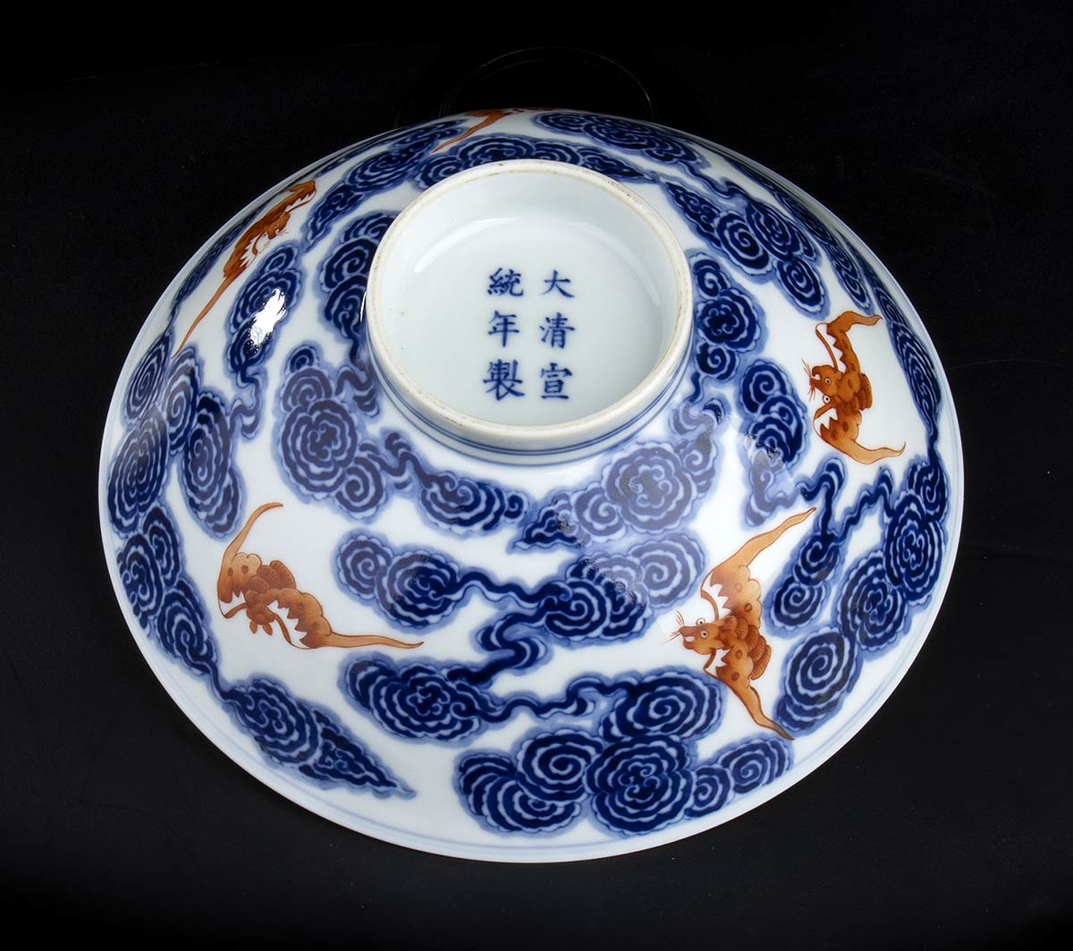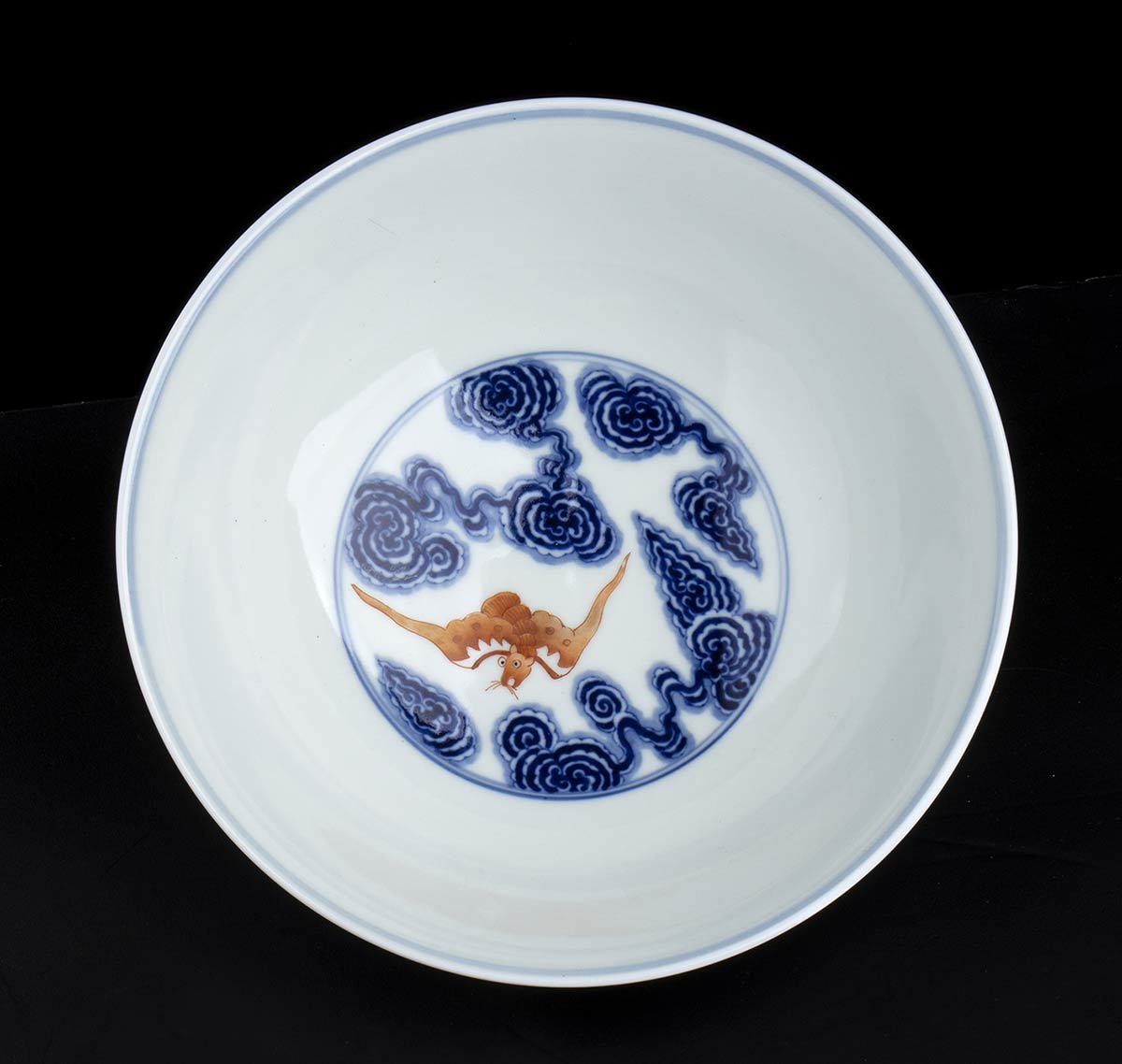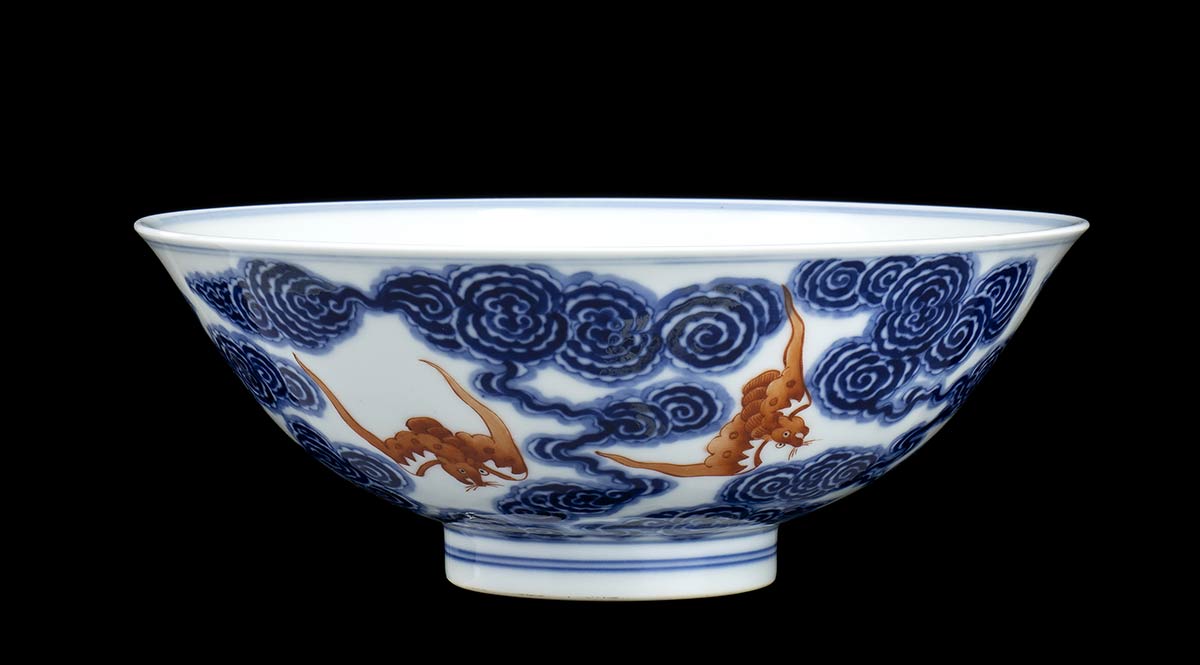 CIOTOLA IN PORCELLANA CON DECORO A SMALTI BLU DI COBALTO E ROSSO DI FERRO