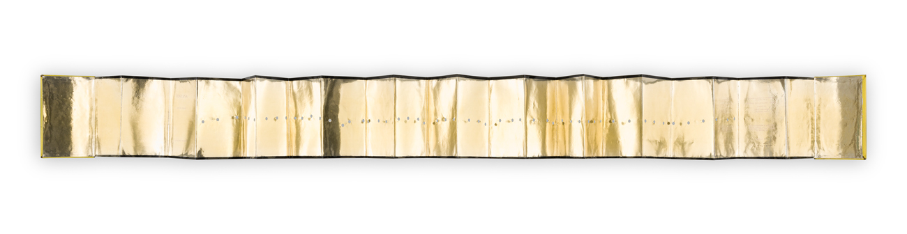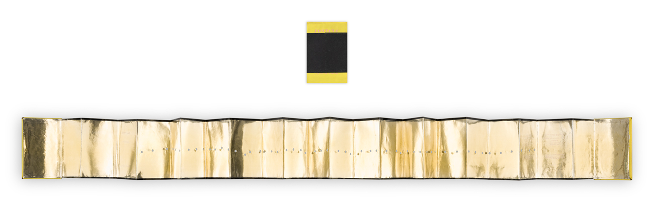 Album pieghevole in carta oro con buchi, avvolto in una copertina in vinile giallo